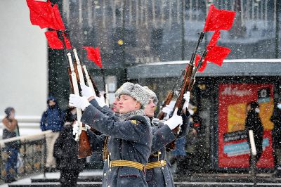 Перед входом в торговый центр «Пассаж» прошла акция «Весенний букет», организованная военнослужащими Центрального военного округа с участием роты почетного караула и оркестра ЦВО.