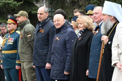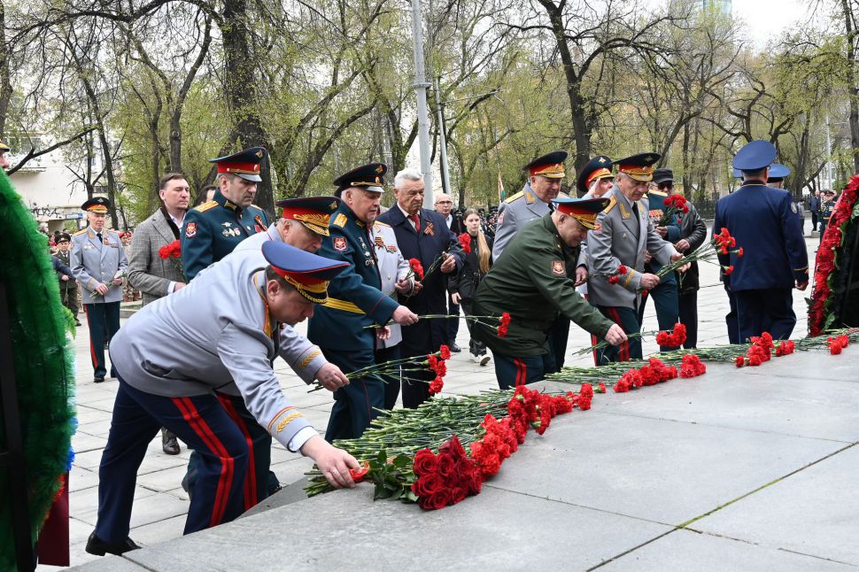 Венки и красные гвоздики к памятнику возложили временно исполняющий обязанности командующего войсками ЦВО Дмитрий Глушенков, председатель Законодательного собрания Свердловской области Людмила Бабушкина, глава Екатеринбурга Алексей Орлов, а также руководители силовых ведомств, участники общественных и военно-патриотических организаций, юнармейцы. По традиции участие в церемонии приняли ветераны и труженики тыла.