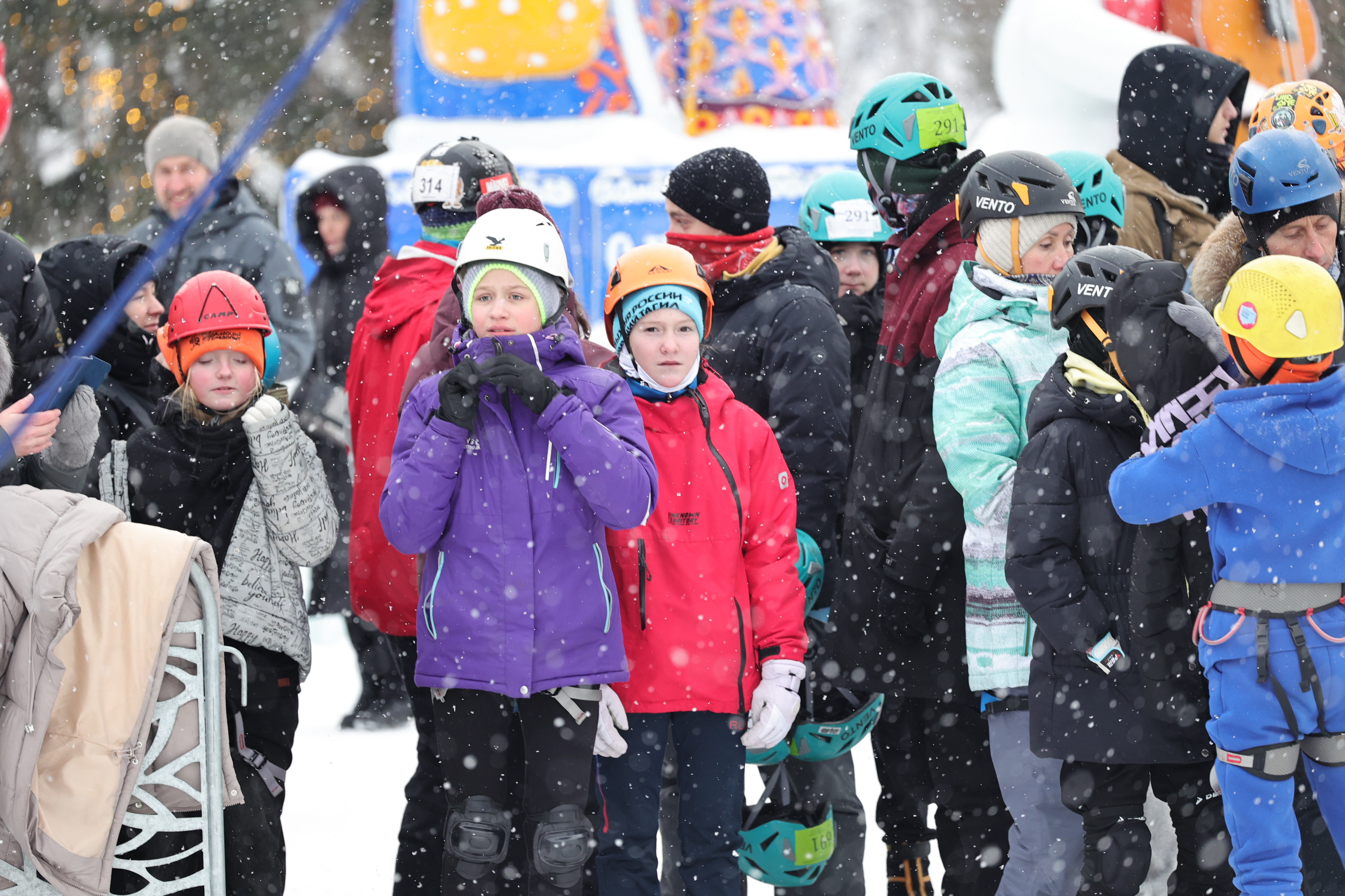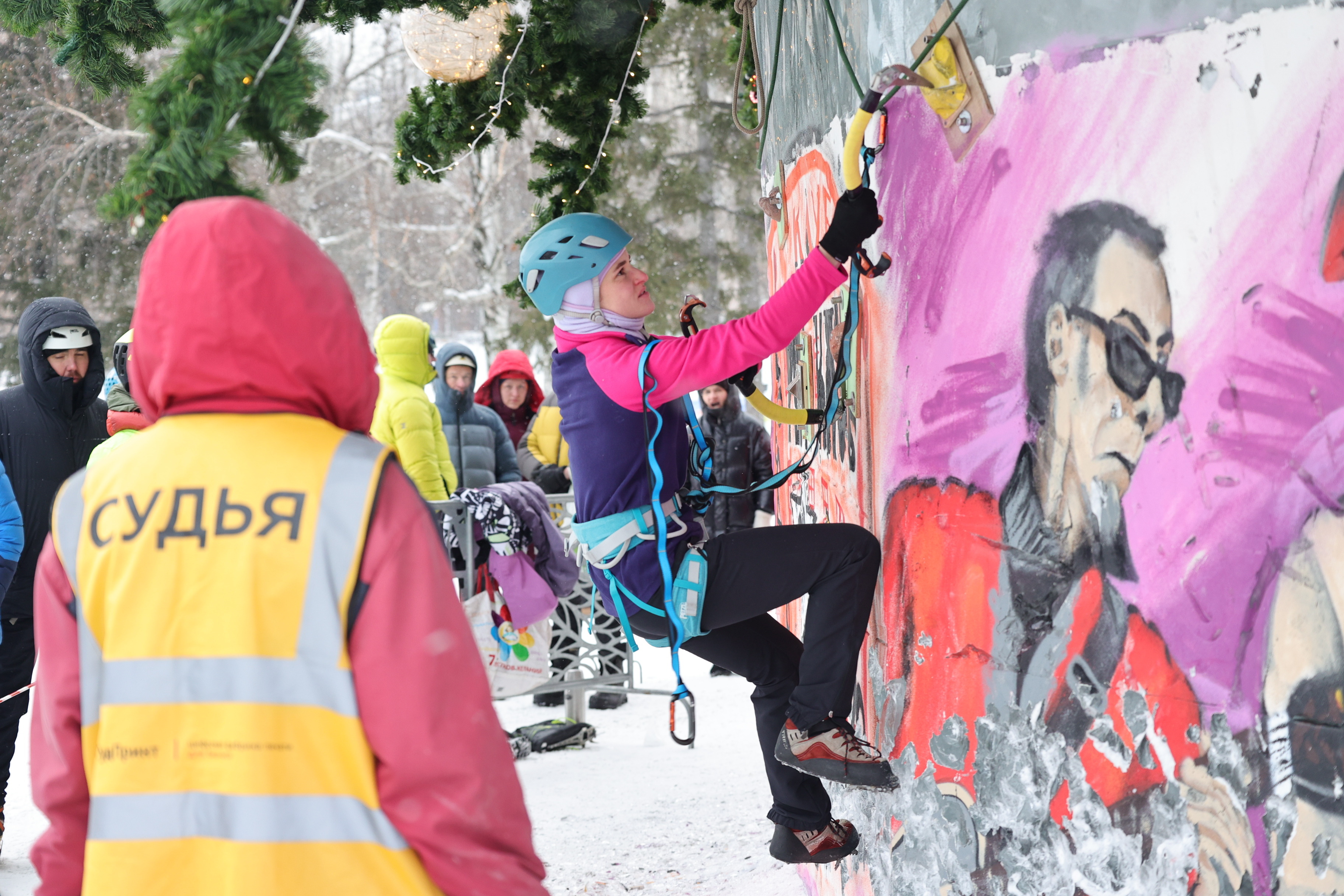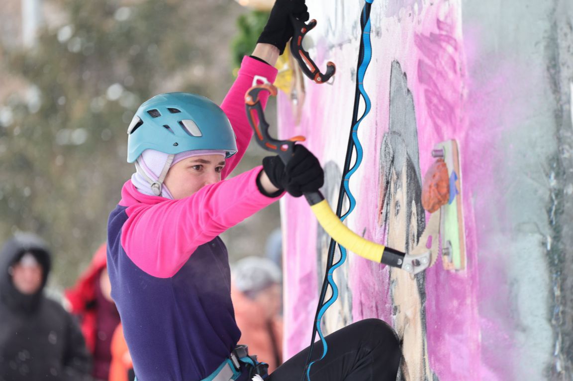Также организаторы приготовили для участников испытание на скорость. У каждого есть две попытки, чтобы быстрее всех забраться вверх по ледовой стене.