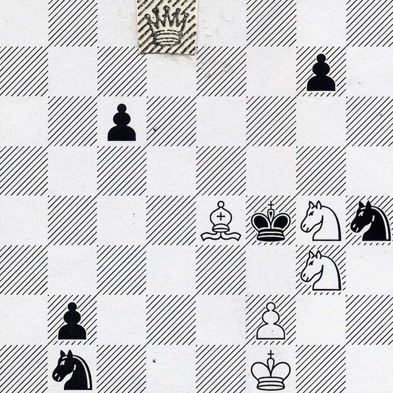 Белые: Kpf1, Фd8, Ce4, Kg3, Kg4, п. f2. Чeрные: Kpf4, Kb1, Kh4, п. b2, c6, g7. Мат в 4 ходa.