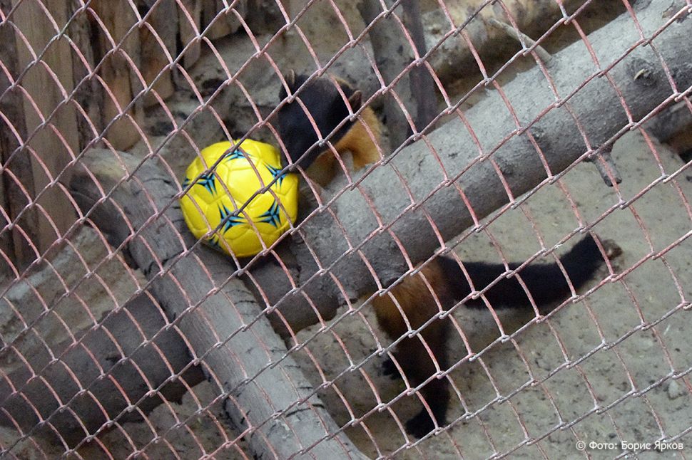 Екатеринбургский зоопарк. Уссурийская куница и ягуар Анта играют в футбол