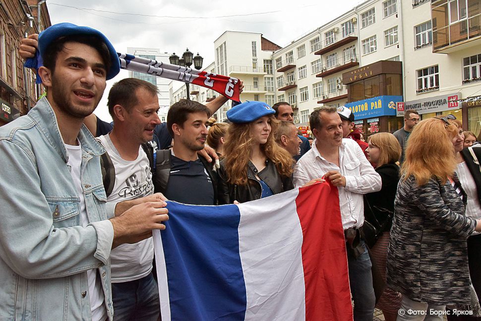 В отличие от перуанцев группы поддержки сборной Франции не столь многочисленны. Но при этом они пели Марсельезу, играли с футбольным мячом, танцевали и активно фотографировались с жителями Екатеринбурга. Корреспондент «УР» даже зафиксировал общение французских болельщиков со своими соперниками по группе — перуанцами. Братание завершилось распитием пенного напитка и общей фотографией на память.