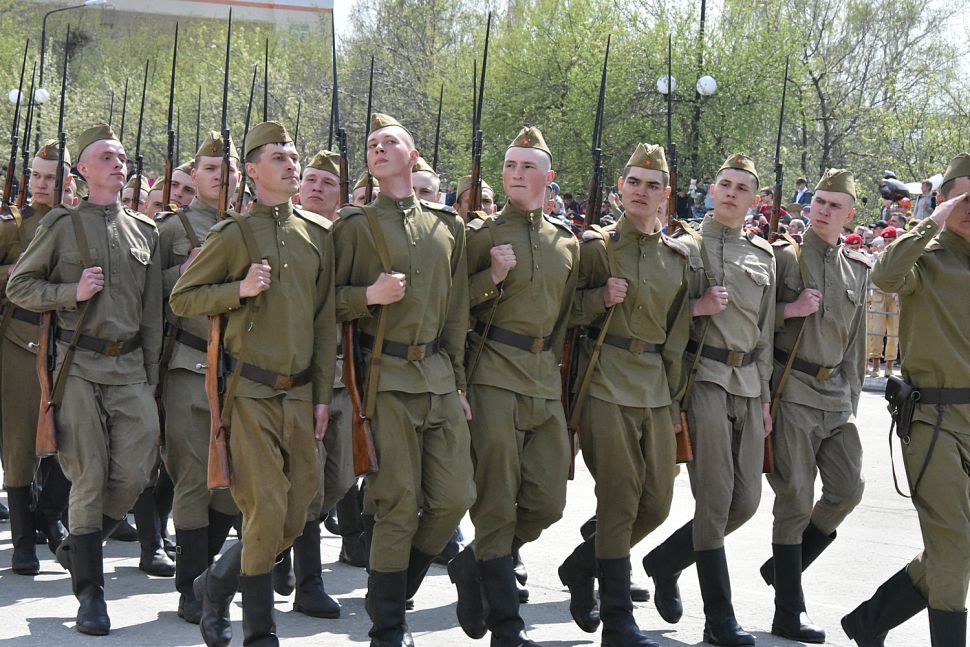 Перед показом военной техники перед гостями шествия прошли в боевом строю уральцы, одетые в военную форму сороковых годов прошлого века – это пехотинцы, танкисты, матросы.