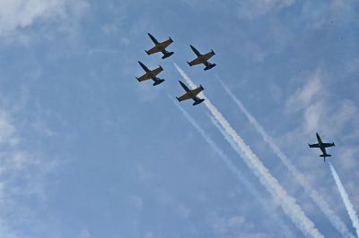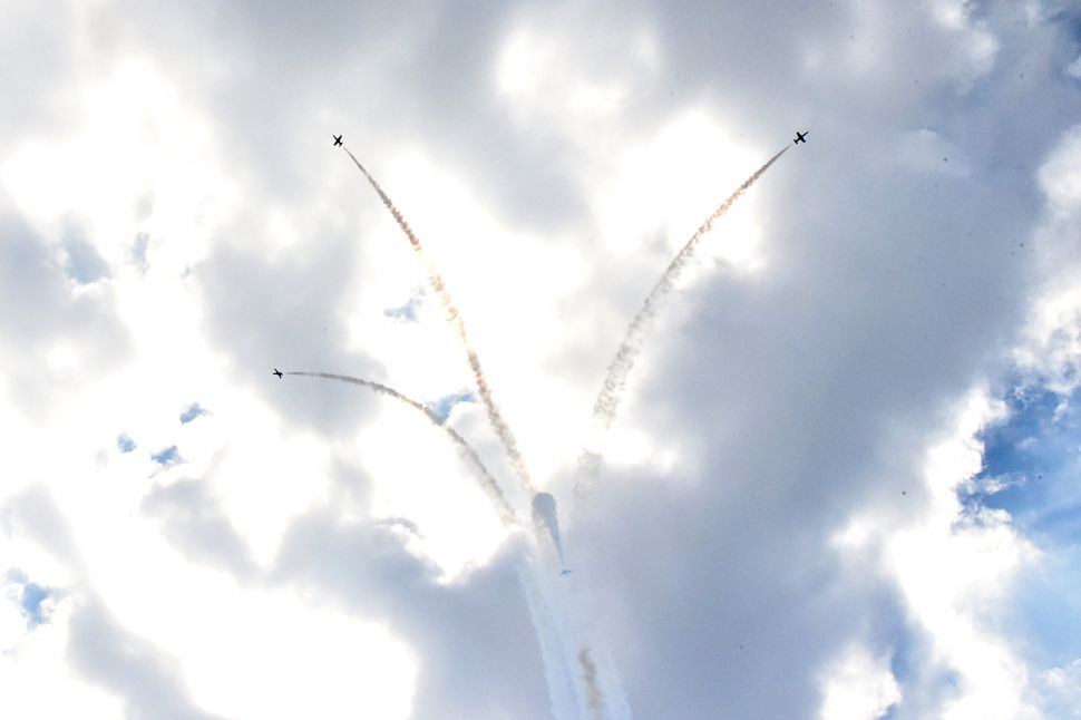 Кульминацией шествия стало авиошоу с участием пилотажной группы «Русь». Они выполнили фигуры высшего пилотажа и даже «нарисовали» на небе сердце, пронзенное «стрелой».