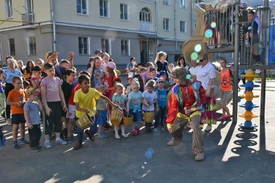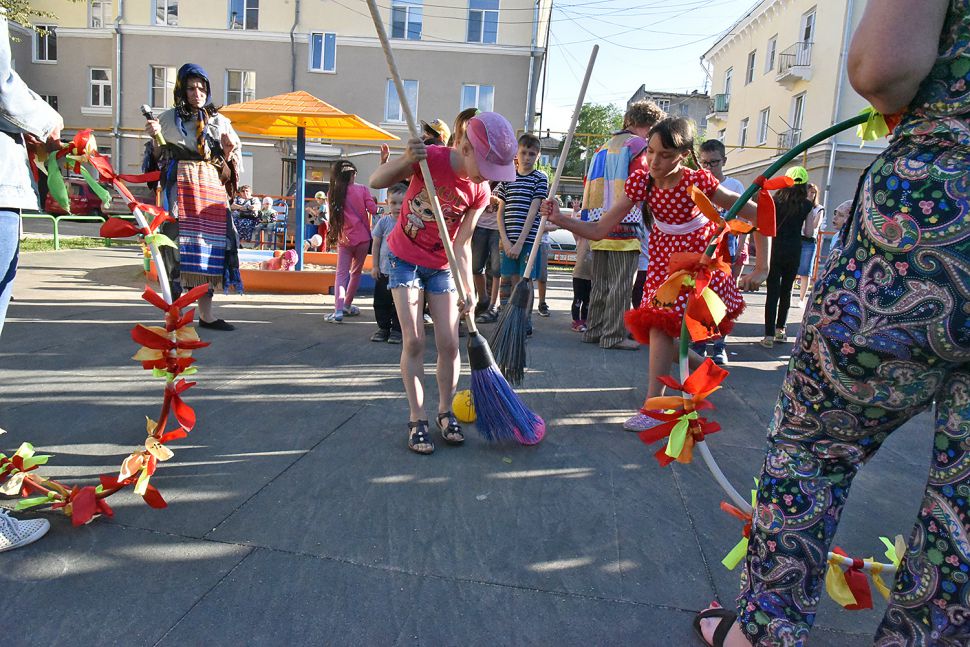 В продолжение праздника герои любимых детских сказок Домовенок Кузя и Баба Яга поиграли в веселые игры. Они научили юных соседей следить за чистотой двора в игровой форме «метлабол».