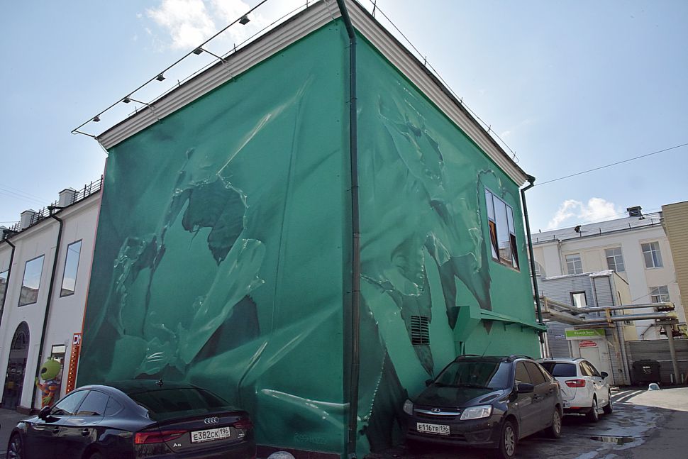 Российский художник Данила Шмелёв преобразил здание рядом со станцией метро «Площадь 1905 года». На стенах дома нарисован огромный зелёный пластиковый пакет, который почти невозможно отличить от реального. Своей работой Данила хотел привлечь внимание к теме экологии и рационального использования ресурсов.