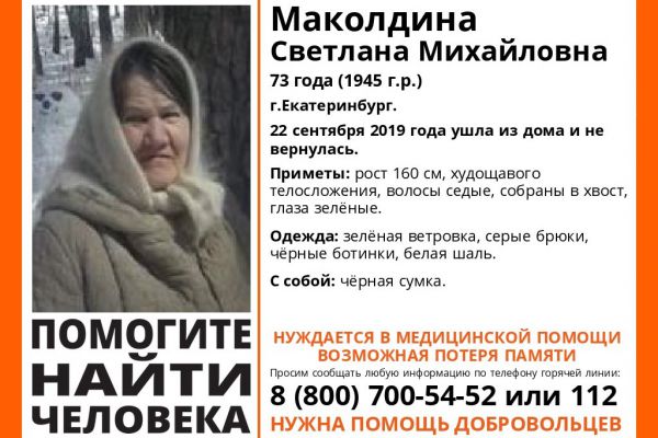 На Вторчермете в Екатеринбурге потерялась пенсионерка Светлана Маколдина. Женщина ушла из дома в переулке Рижском в воскресенье, 22 сентября, и пропала. Родственники говорят, что бабушка могла потерять память.