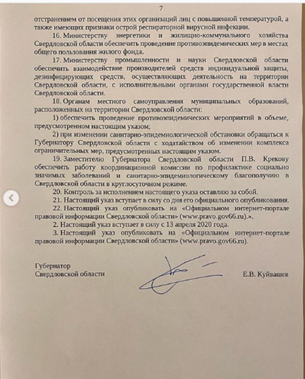 Надеюсь, вы меня поймете. И введение ограничительных мер, и разрешение предприятиям работать — очень сложные решения. Каждый день я пытаюсь найти баланс, чтобы дать возможность вам зарабатывать на жизнь, и при этом не подвергать вас же повышенной опасности», – написал Евгений Куйвашев в социальной сети.