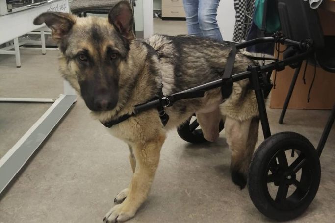 Нижнюю часть задних лап пришлось ампутировать, поскольку после аварии они были сильно перебиты.