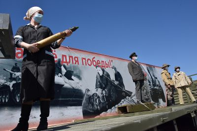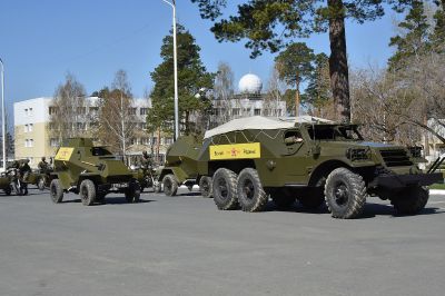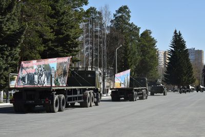 Сегодня журналисты побывали на репетиции театрализованной выставки-реконструкции, которая будет отображать ход исторических событий времен Великой Отечественной. Для этого уже готова колонна из 11 военных грузовиков с платформами-баннерами с изображением основных этапов Великой Отечественной войны: битва под Москвой, оборона Ленинграда и Севастополя, Сталинградское сражение, взятие Берлина.