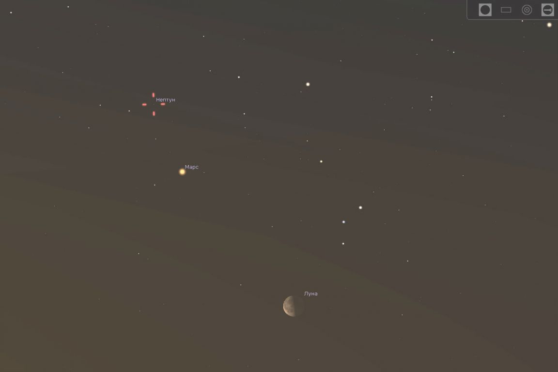Спутник Земли с Марсом будут видны невооруженным взглядом, а вот Нептун не увидеть без телескопа или бинокля.
