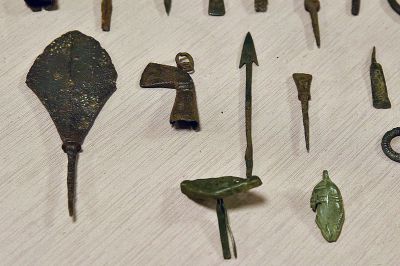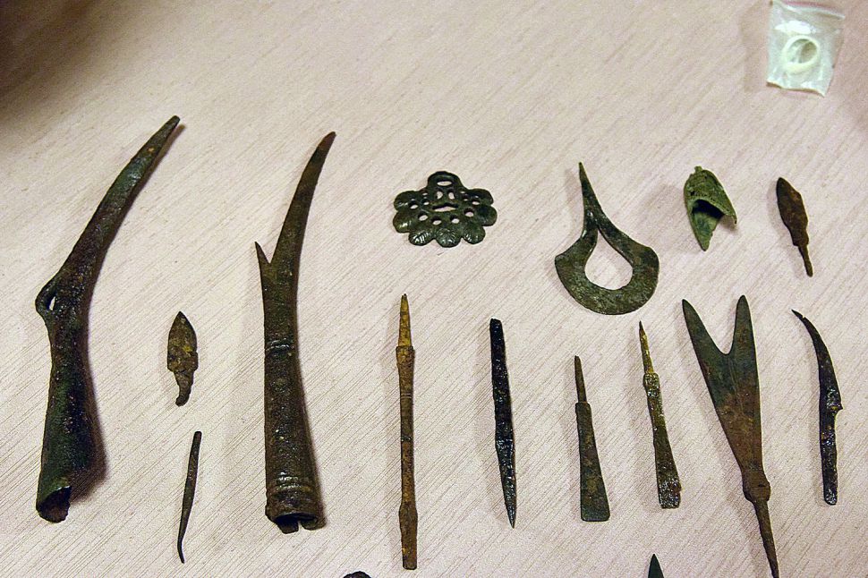 Сегодня журналистам показали археологические артефакты. Это наконечники багра, рыболовные крючок и стрела, бронебойные наконечники стрел, кольца, подвески, колокольчики.