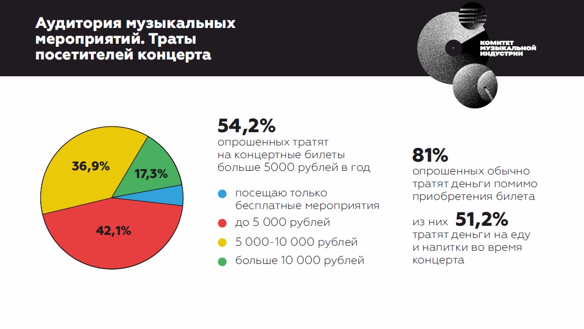 Своим опытом поделились с комитетом поделились 1100 посетителей концертов, 17 экспертов и сотня представителей самого бизнеса. Оказалось, что почти 95% хотя бы раз в год ходят на концерты, половина тратит на билеты больше 5 тысяч рублей и еще вдобавок покупает на концертах сопутствующие товары. По числу упоминаемости в СМИ музыкальный Екатеринбург и в прошлом и в этом году оставил далеко позади Казань и Новосибирск.