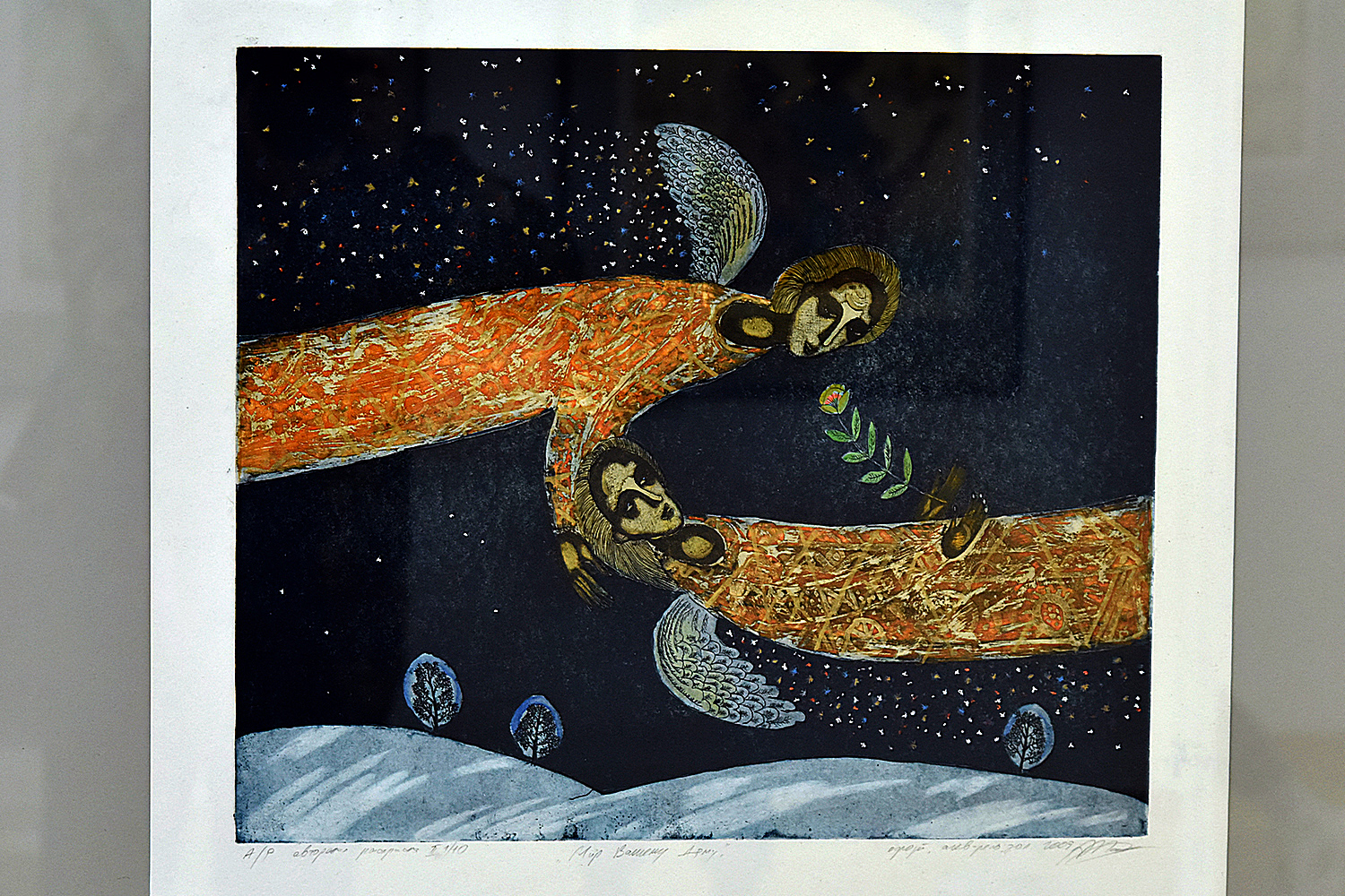 Омский художник лично представил экспозицию, включающую более 50 цветных офортов. Уникальным является серия графических листов Машанова «Книга Ангелов», на которых изображены парящие крылатые фигуры. Еще одно творческое увлечение художника – это соприкосновение графики и каллиграфии. Сейчас почти ни одна персональная выставка не проходит без участия каллиграфических произведений, иногда в форме графического листа с емкой фразой, иногда в форме огромного раскрытого свитка – «Песнь царя Соломона» (2018).