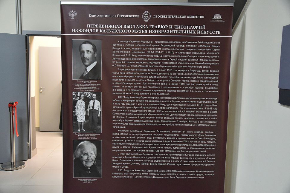 Посетители Исторического парка могут увидеть уникальное собрание гравированных и литографированных портретов представителей Российского Императорского Дома, виды резиденций, дворцов и храмов Москвы и Санкт-Петербурга, созданных русскими и иностранными мастерами в первой половине XVIII – начале XX века. Коллекция из частного собрания героя Первой мировой войны, известного деятеля русской эмиграции, потомственного дворянина Александра Гершельмана была передана в дар Калужскому музею изобразительных искусств его дочерью Мариной Аксаковой в память о муже Сергее Аксакове, мичмане Русского Императорского флота, уроженце Калужской области.
