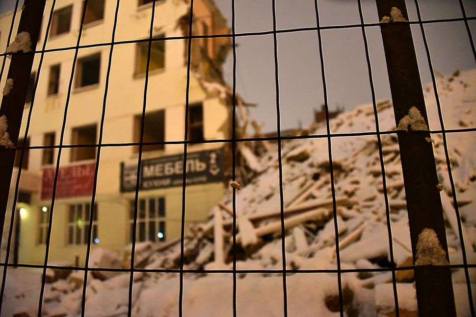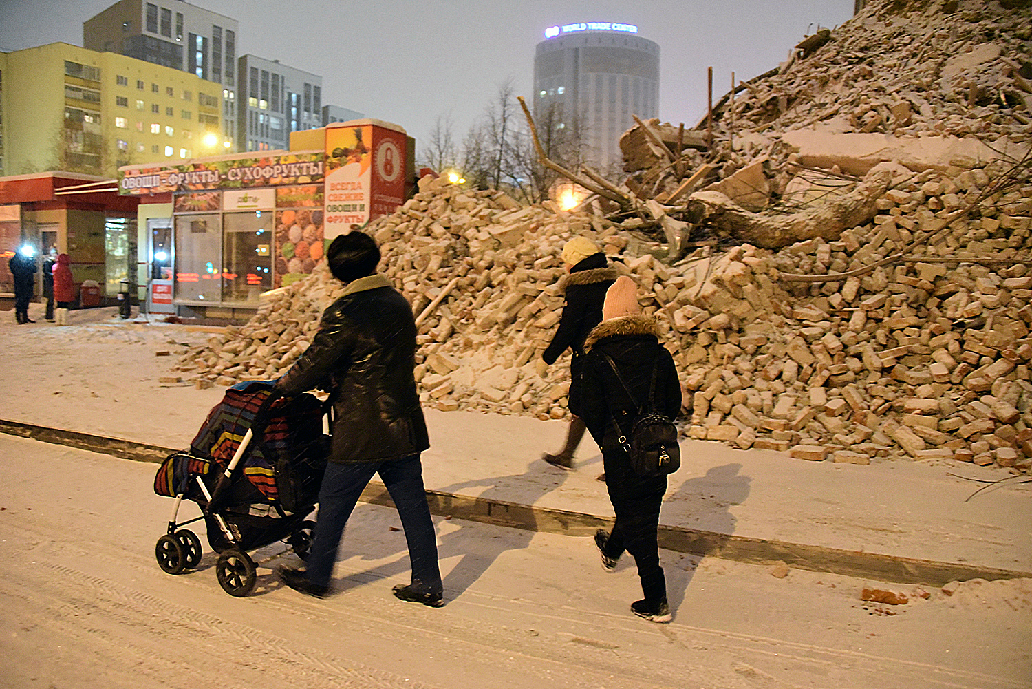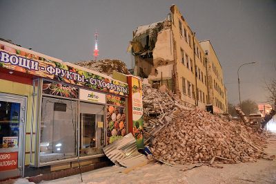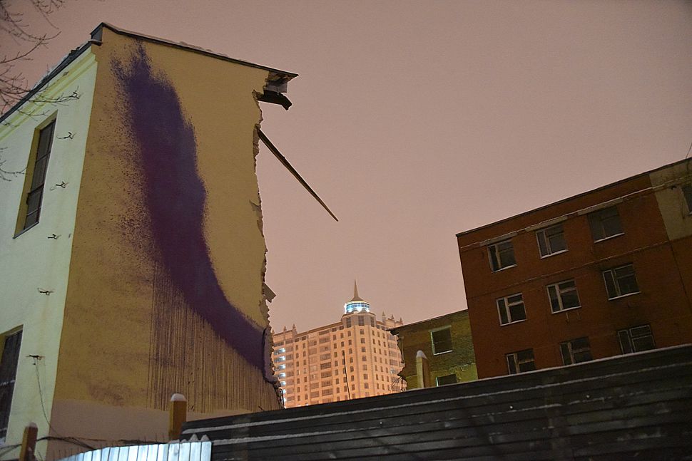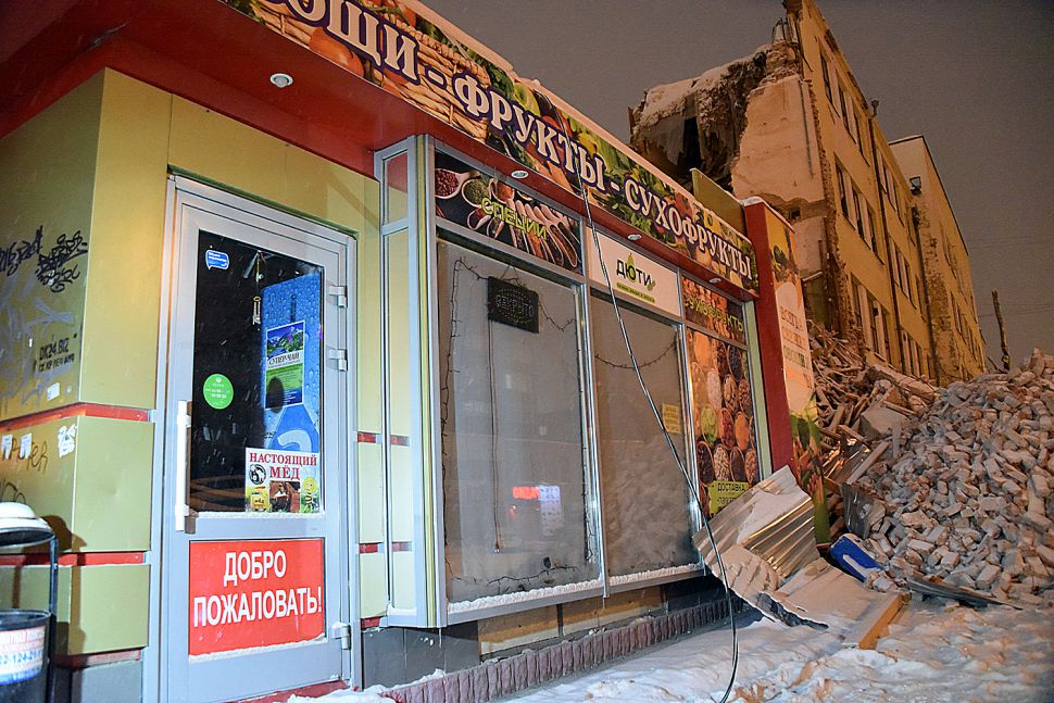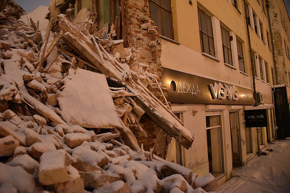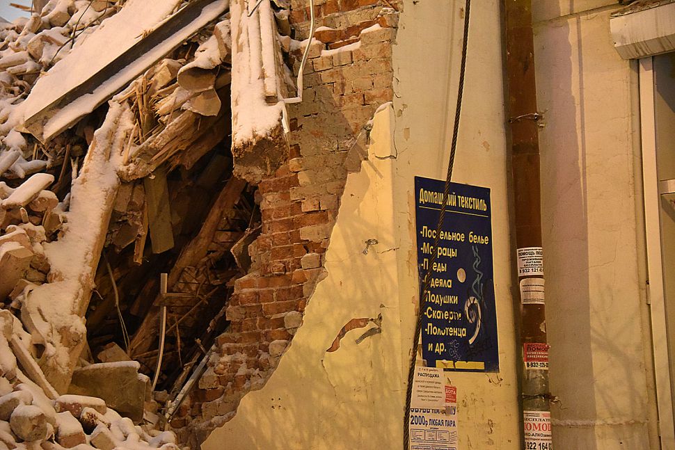 Фоторепортаж: в Екатеринбурге стена дома рухнула на тротуар и проезжую часть дороги
