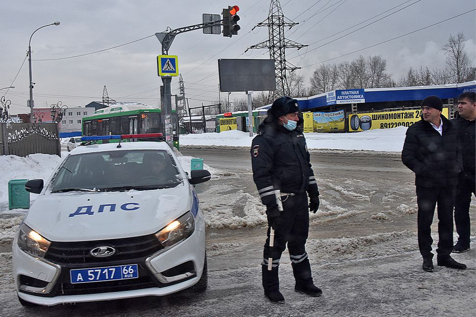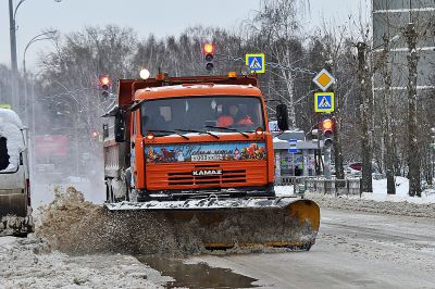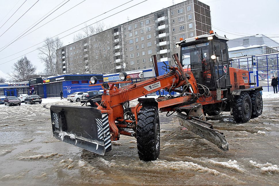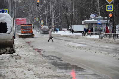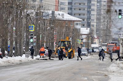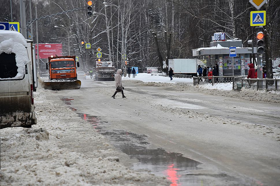 Во второй половине дня на улице Пехотинцев работала дорожная техника, расчищая проезжую часть от снега и наледи. Аварийный участок дороги перекрыли сотрудники ГИБДД.