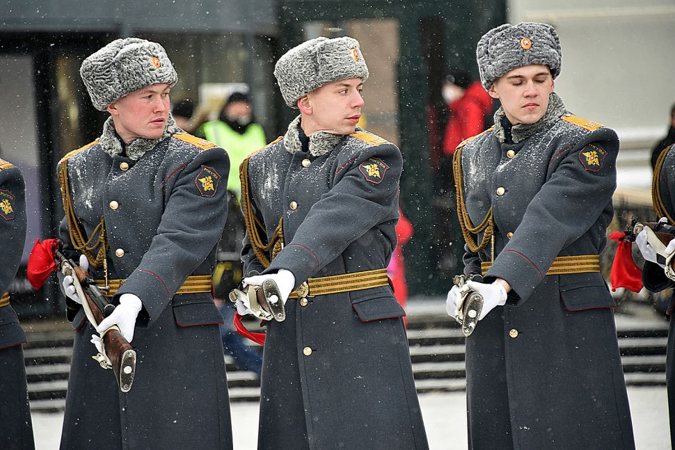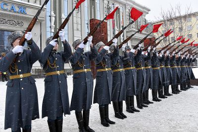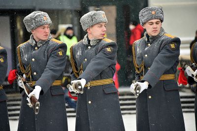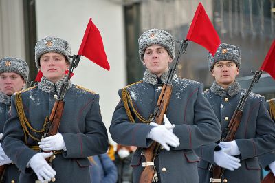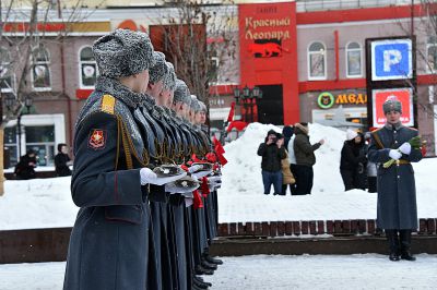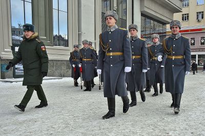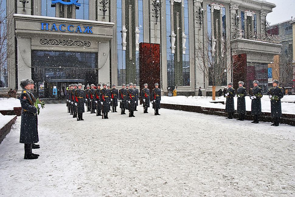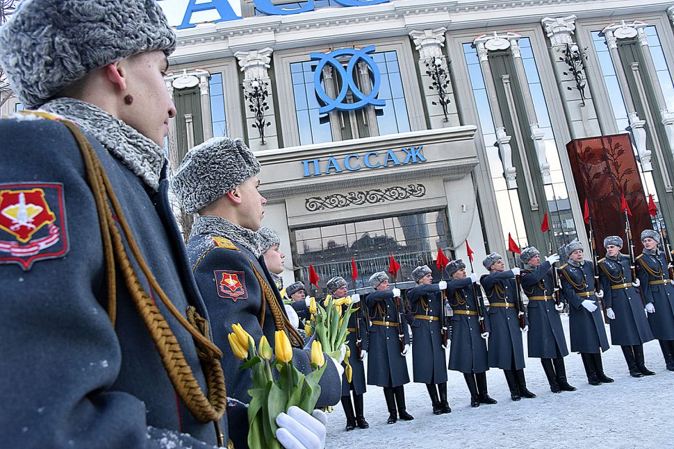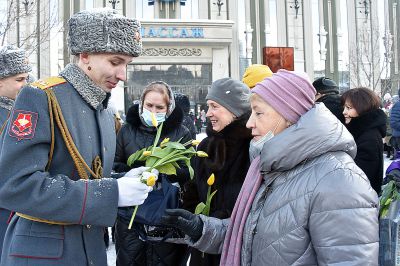 Перед входом в торговый центр «Пассаж» прошла акция «Весенний букет», организованная военнослужащими Центрального военного округа с участием роты почетного караула и оркестра ЦВО.