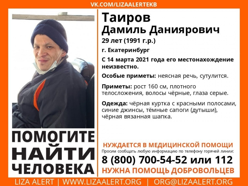 Таиров родом из Пермского края – там он пропал еще 31 декабря 2020 года в поселке Оверята Краснокамского района. С тех пор его ищут и даже объявили в федеральный розыск.