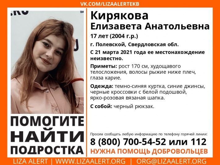 17-летняя студентка Елизавета пропала в Екатеринбурге вместе с 23-летним молодым человеком по имени Андрей. Оба они не выходят на связь с 22 марта.
