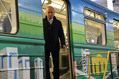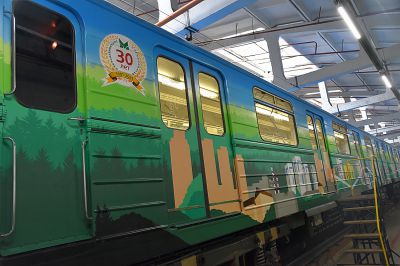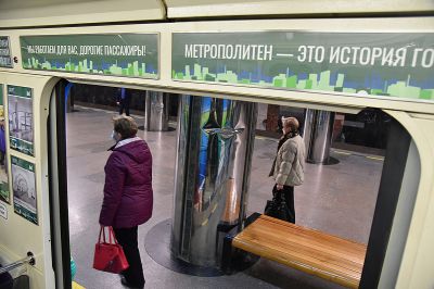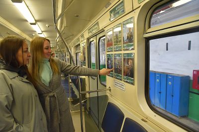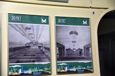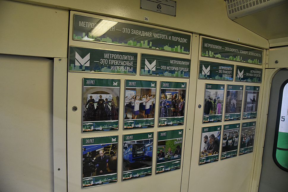 Внутри вагонов развернута фотовыставка, посвященная истории уральского метро: лучшие кадры строительства и открытия станций, почётных гостей, метростроителей, пассажиров и сотрудников подземки.
