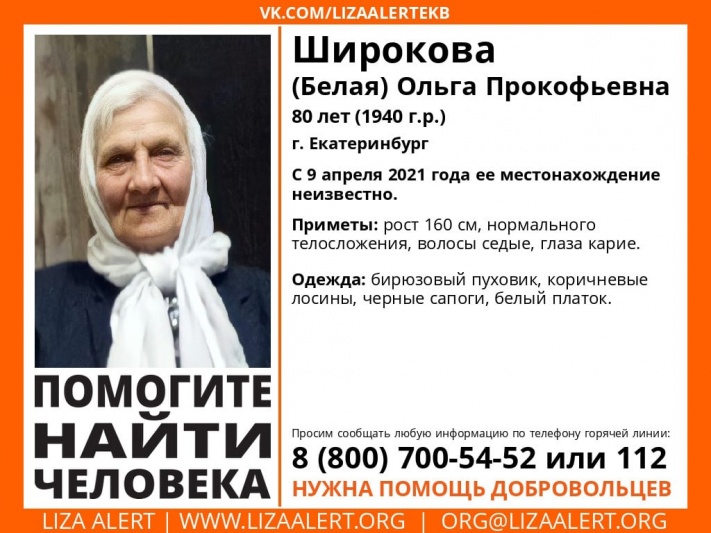Третьи сутки в Екатеринбурге продолжаются поиски 80-летней Ольги Прокофьевны Широковой (Белой). Женщина может плохо ориентироваться в пространстве. Она вышла из дома 9 апреля примерно в 14:00 и пропала.