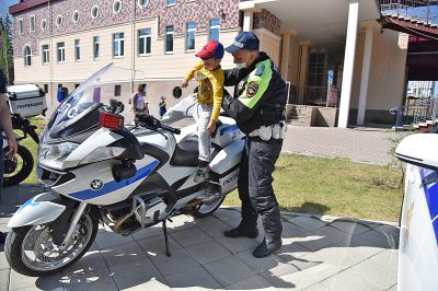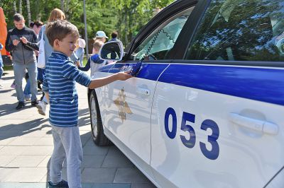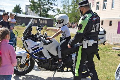 На площадке также были представлены транспортные средства ГИБДД: патрульный автомобиль ДПС и мотоциклы, в которых можно сфотографироваться. А самые любопытные дети могли включить сирену на патрульной машине.