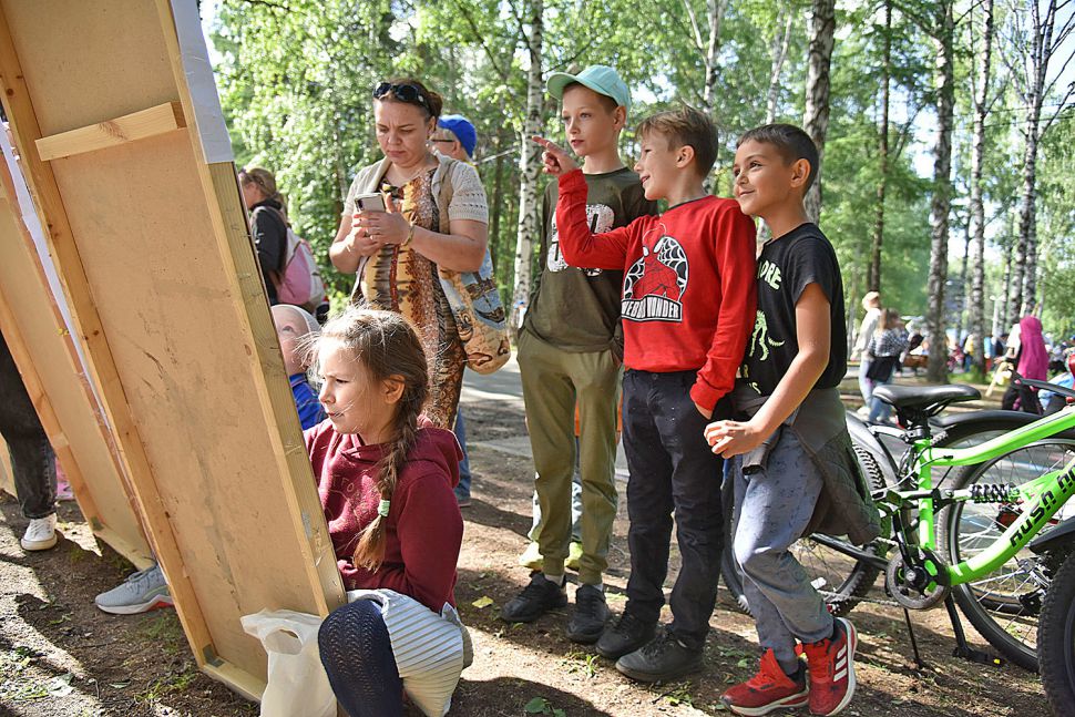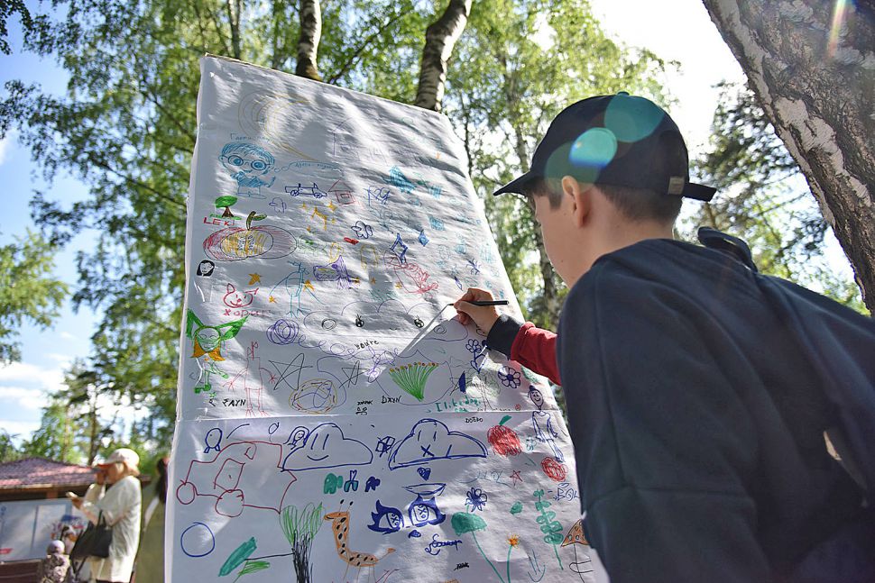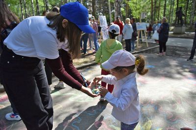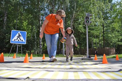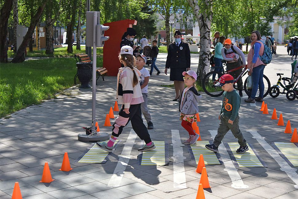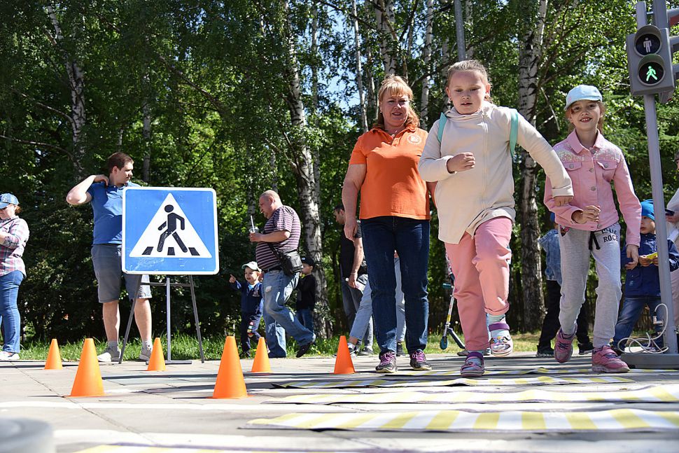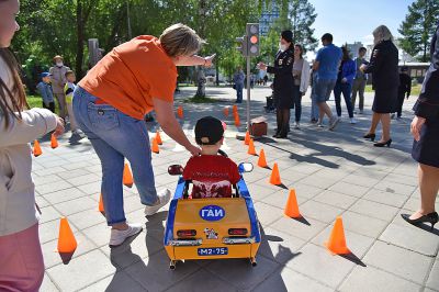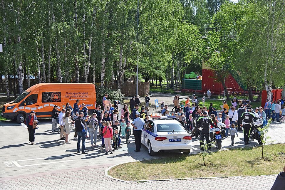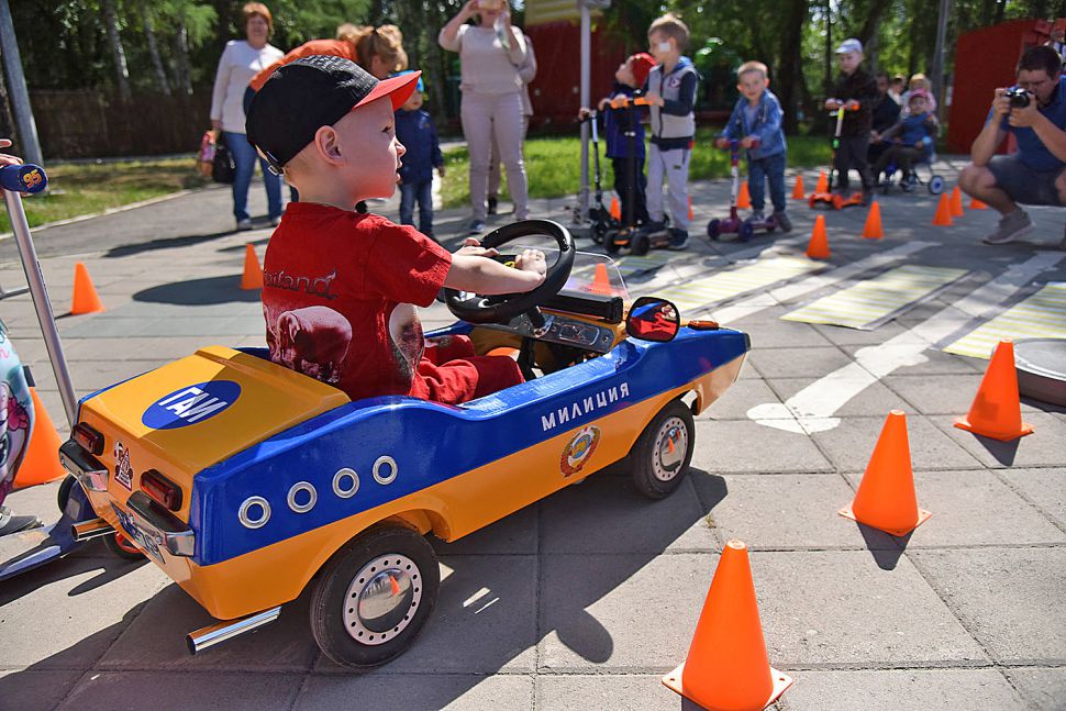 Здесь дети повторяли правила поведения на дороге, учились переходить дорогу по пешеходному переходу, ездить на самокатах по правилам дорожного движения. А один юный автолюбителей приехал в парк на старой гаишной машине.