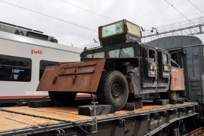 В составе воинского эшелона 17 вагонов. На платформах представлены современные образцы техники и вооружения: бронеавтомобили «Тайфун-К», танк Т-90М, самоходная артиллерийская установка «Коалиция-СВ» и другие, а также военные трофеи, привезенные из Сирии – бронеавтомобили «Хаммер-1» и «Пантера».