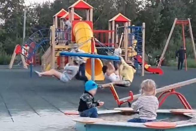 – Хорошая погода и зачастую алкоголь и вот уже великовозрастный детина лезет на детскую площадку порезвиться.