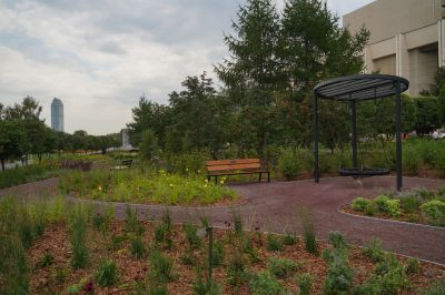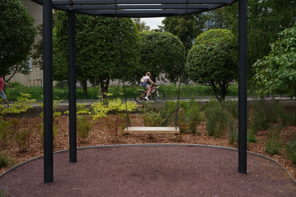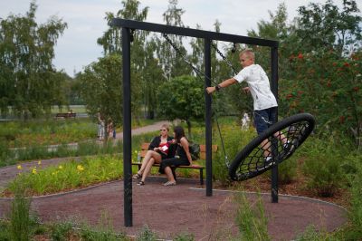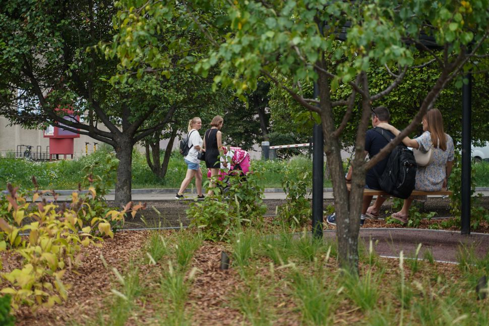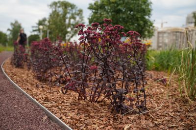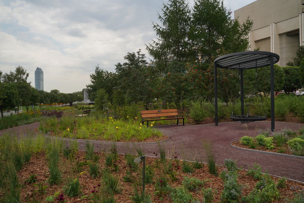 На набережной городского пруда в Екатеринбурга возле БЦ «Президент» высадили аллею из 14 яблонь и установили спортивные снаряды. Помимо деревьев в саду трав высадили декоративные кустарники и около сотни видов растений. Таким образом город готовится отметить День строителя, масштабное празднование которого, не состоится из-за пандемии.