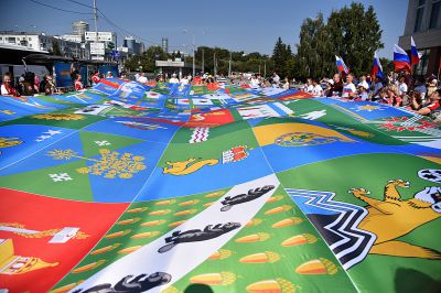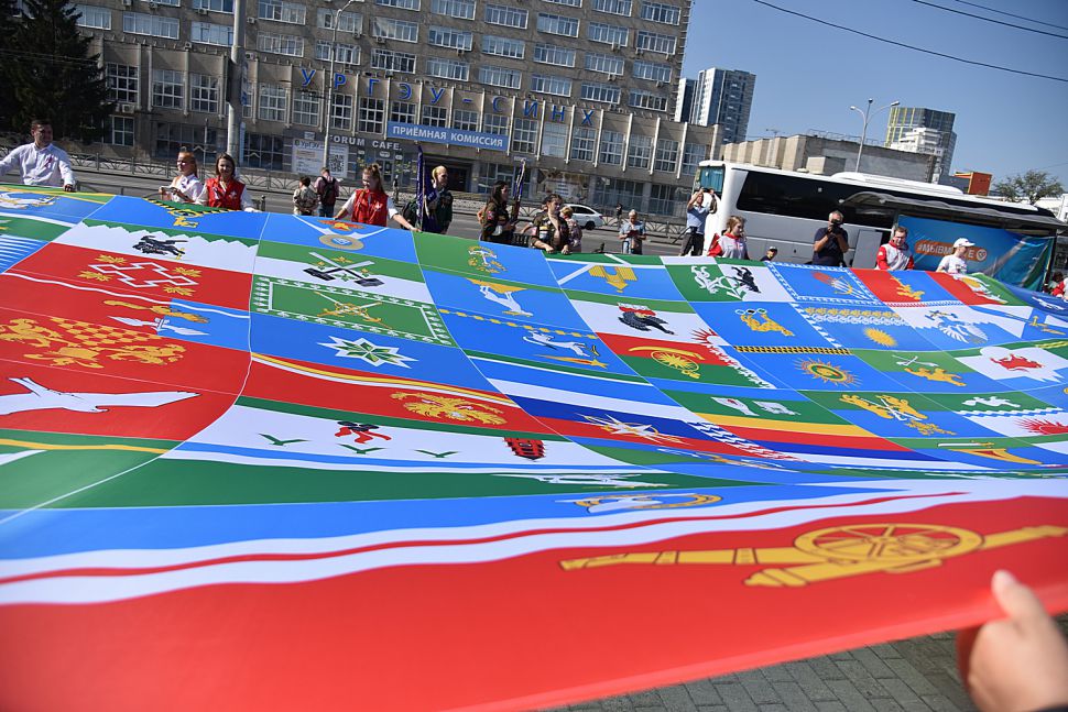 Здесь же были развёрнуты полотнища с флагами муниципальных образований Свердловской области.