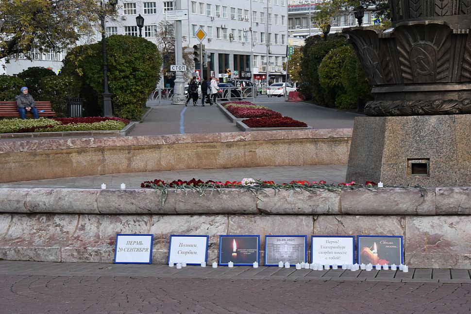 Екатеринбуржцы несут цветы к мемориалу жертвам стрельбы в пермском вузе