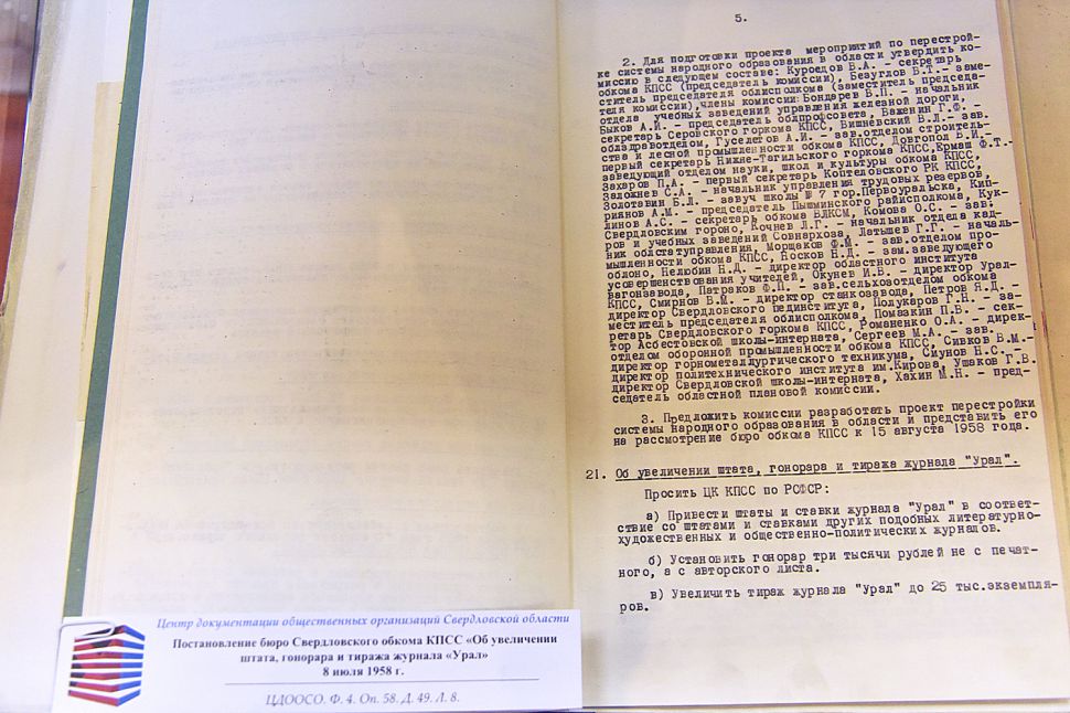 Экспозиция приурочена к 65-й годовщине постановления бюро Свердловского обкома КПСС от 2 октября 1956 года «Об издании в гор. Свердловске литературно-художественного и общественно-политического журнала «Урал».