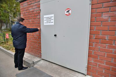 Дверь в коллективную «кладовку» открывается с помощью электронного ключа, который имеется у каждого жильца. На внутренней стороне двери прикреплен ящик для сбора использованных батареек. Внутри два стандартных контейнера для обычных отходов: один наполняют жильцы, второй — организации, расположенные в доме №60, их здесь 22.