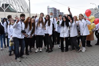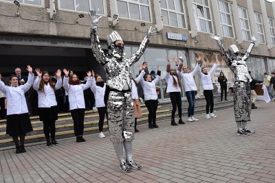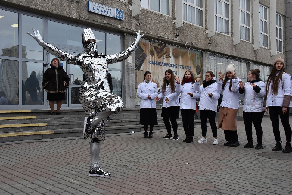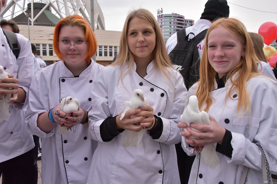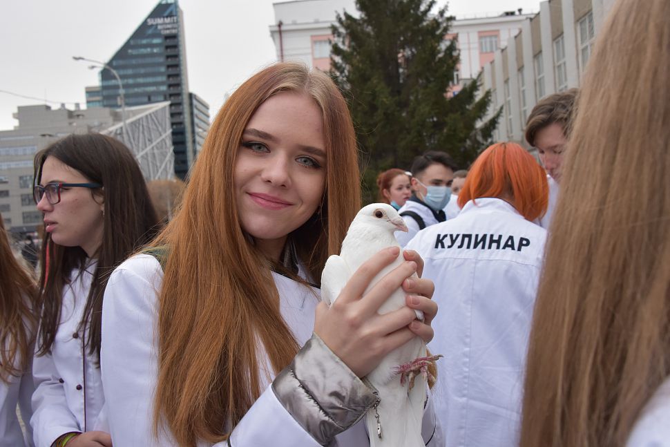 Сразу после церемонии награждения победителей конкурса на площади перед Уральским государственным экономическим университетом состоялся «Марш белого кителя». Его участники запустили в небо белых голубей.