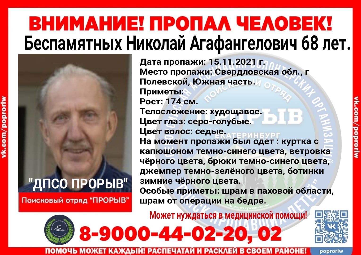 В Полевском волонтеры сутки ищут 68-летнего Николая Агафангеловича Беспамятных. Он ушел из дома в неизвестном направлении 15 ноября. Супруга забила тревогу. Мужчина может нуждаться в медицинской помощи, ранее у него были провалы в памяти.