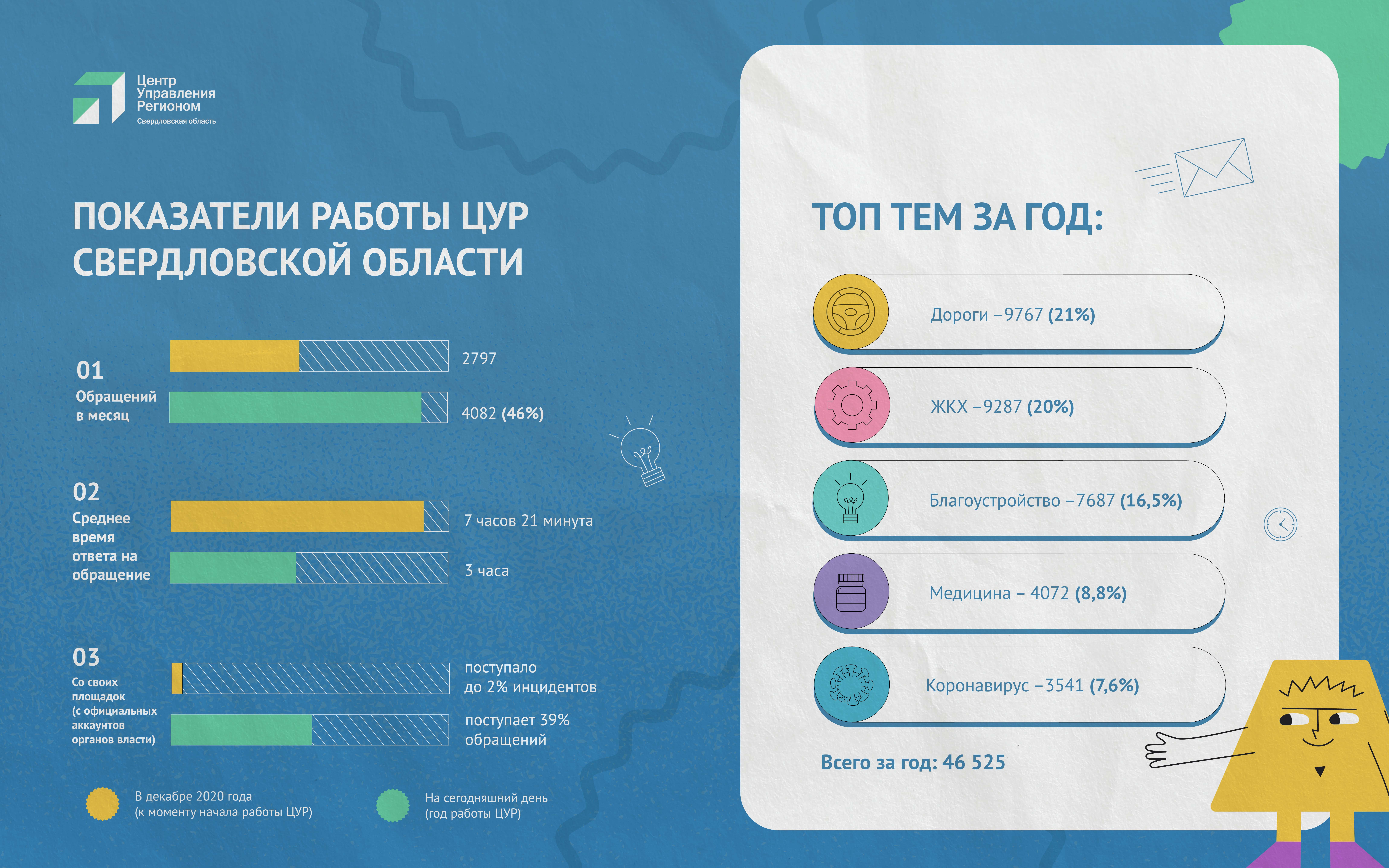 Больше всего жителей Среднего Урала за минувшие 12 месяцев волновали проблемы с дорогами и ЖКХ — специалисты Центра управления регионом обработали 9767 и 9287 обращений по этим темам. Также в топ вошли благоустройство (7687 вопросов), медицина (4072 писем) и коронавирус (3541 сообщение).