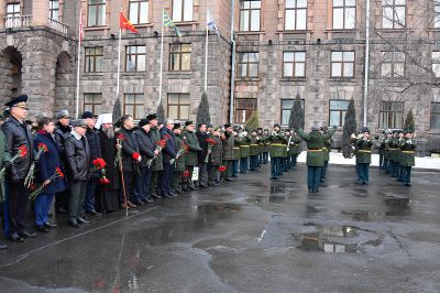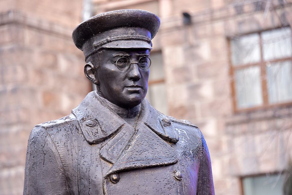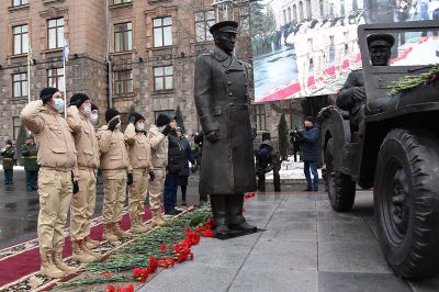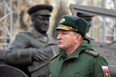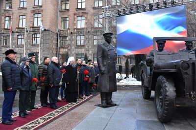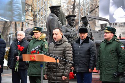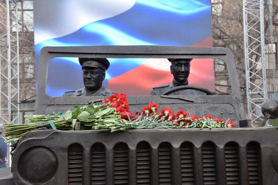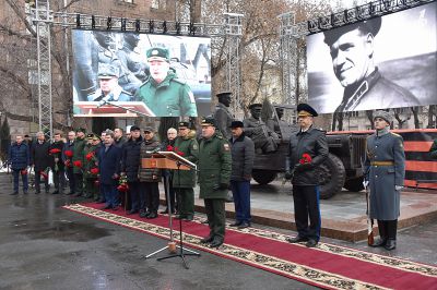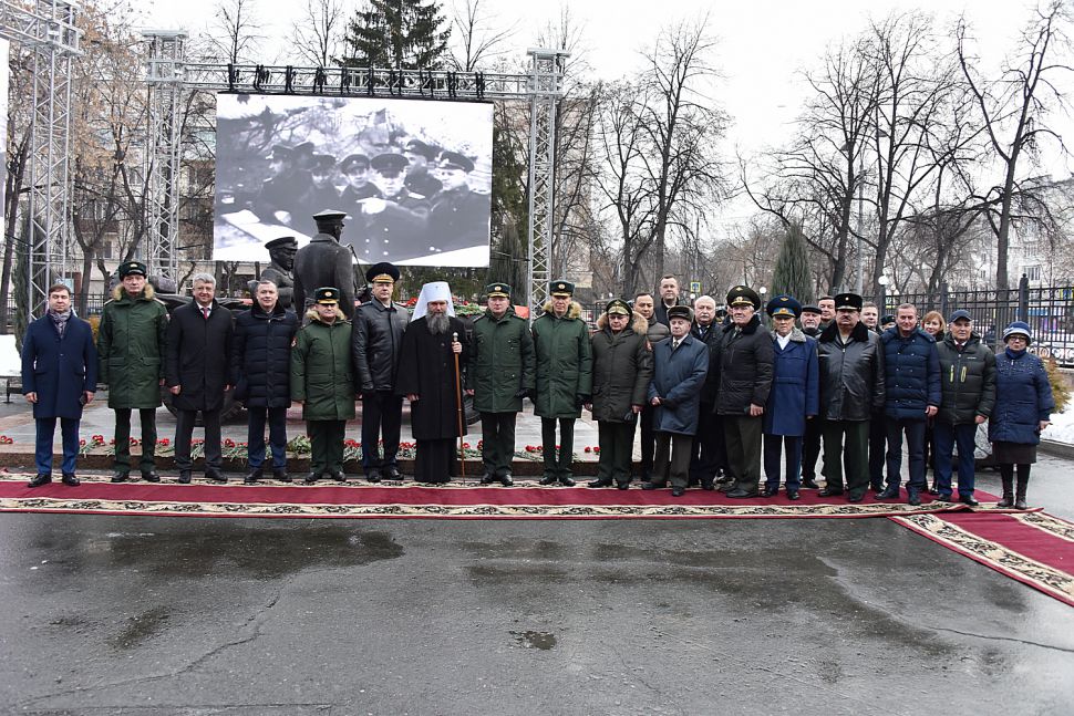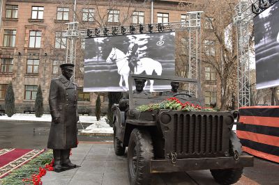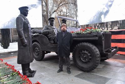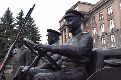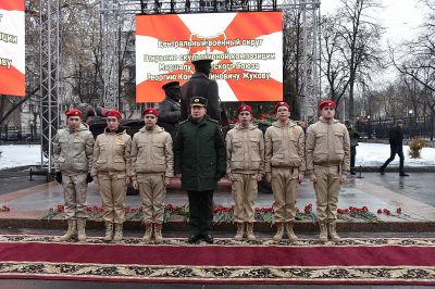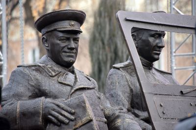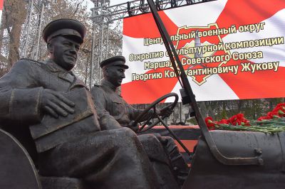 У здания штаба Центрального военного округа в Екатеринбурге в честь 125-летия со дня рождения маршала Советского Союза Георгия Жукова установили скульптурную композицию «Встреча маршала Советского Союза Жукова».