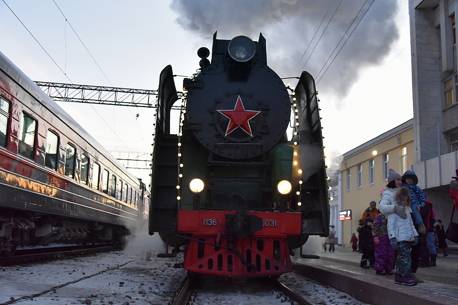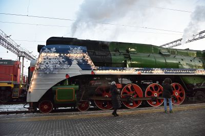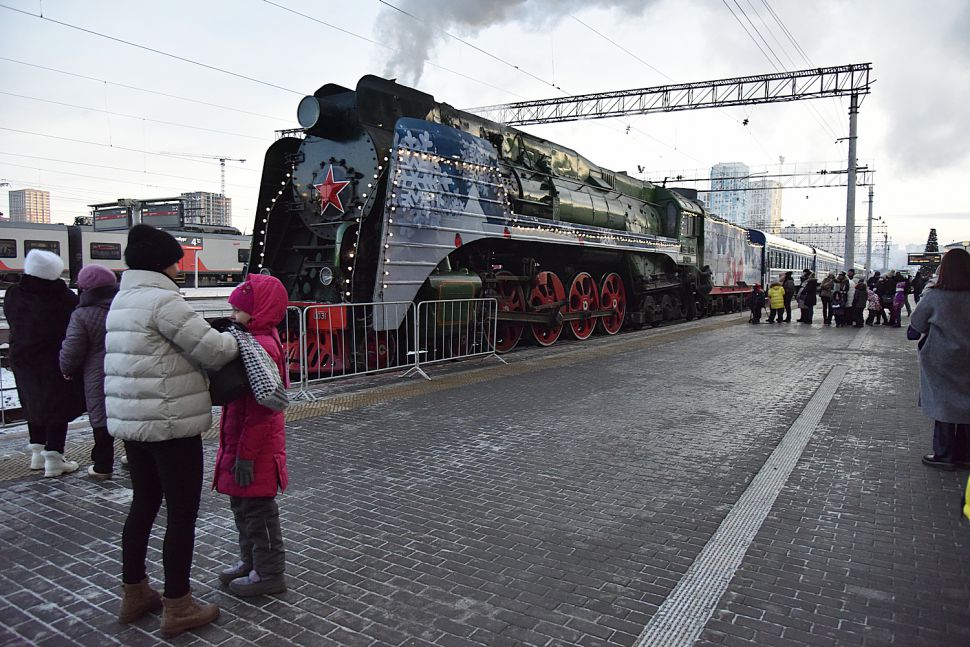 В столицу Урала праздничный состав доставил украшенный новогодними огнями ретро-паровоз – локомотив серии П36, который за лампасы на боках называют «генералом».