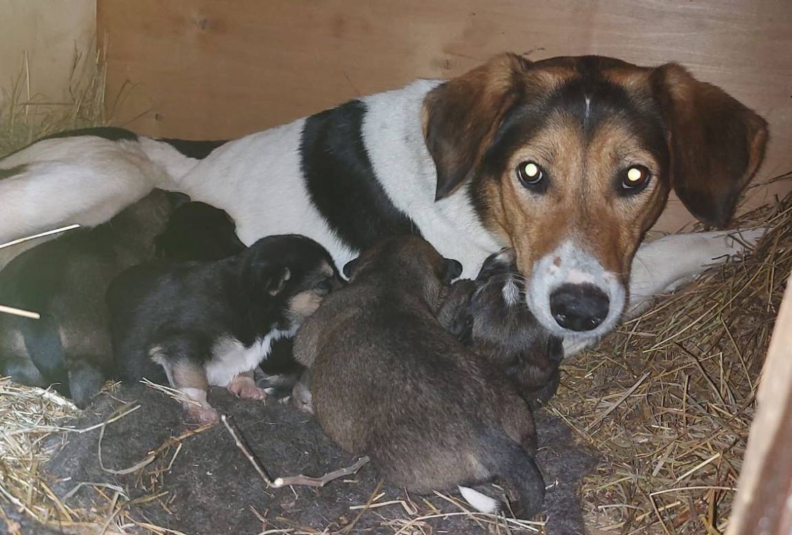Сейчас собака по кличке Мира и ее щенки находятся на передержке, им ищут дом.
