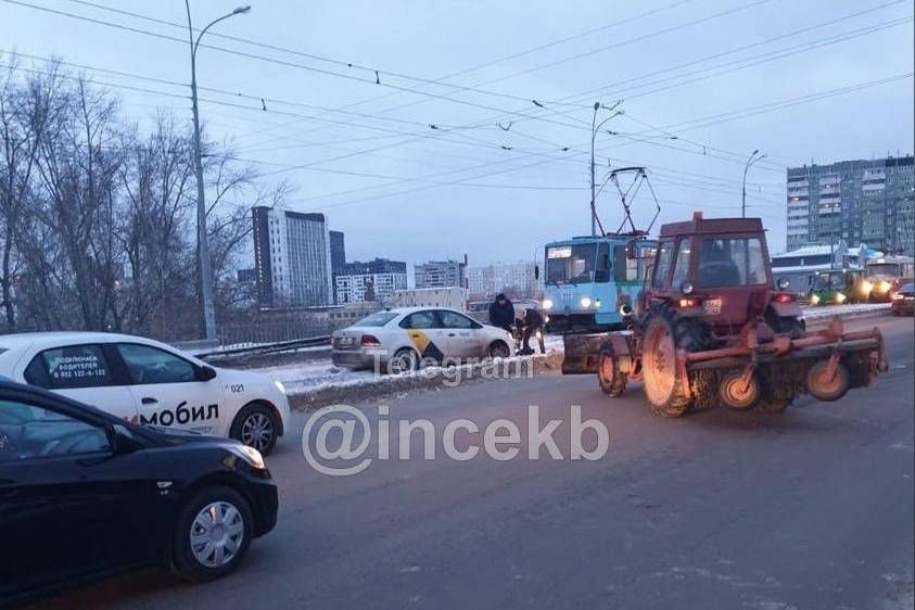 В очередной раз на мосту на улице Малышева на ЖБИ автомобилист заехал на трамвайные пути. Машина такси застряла на рельсах и трамваи встали, сообщается в паблике ВКонтакте «Инцидент Екатеринбург».