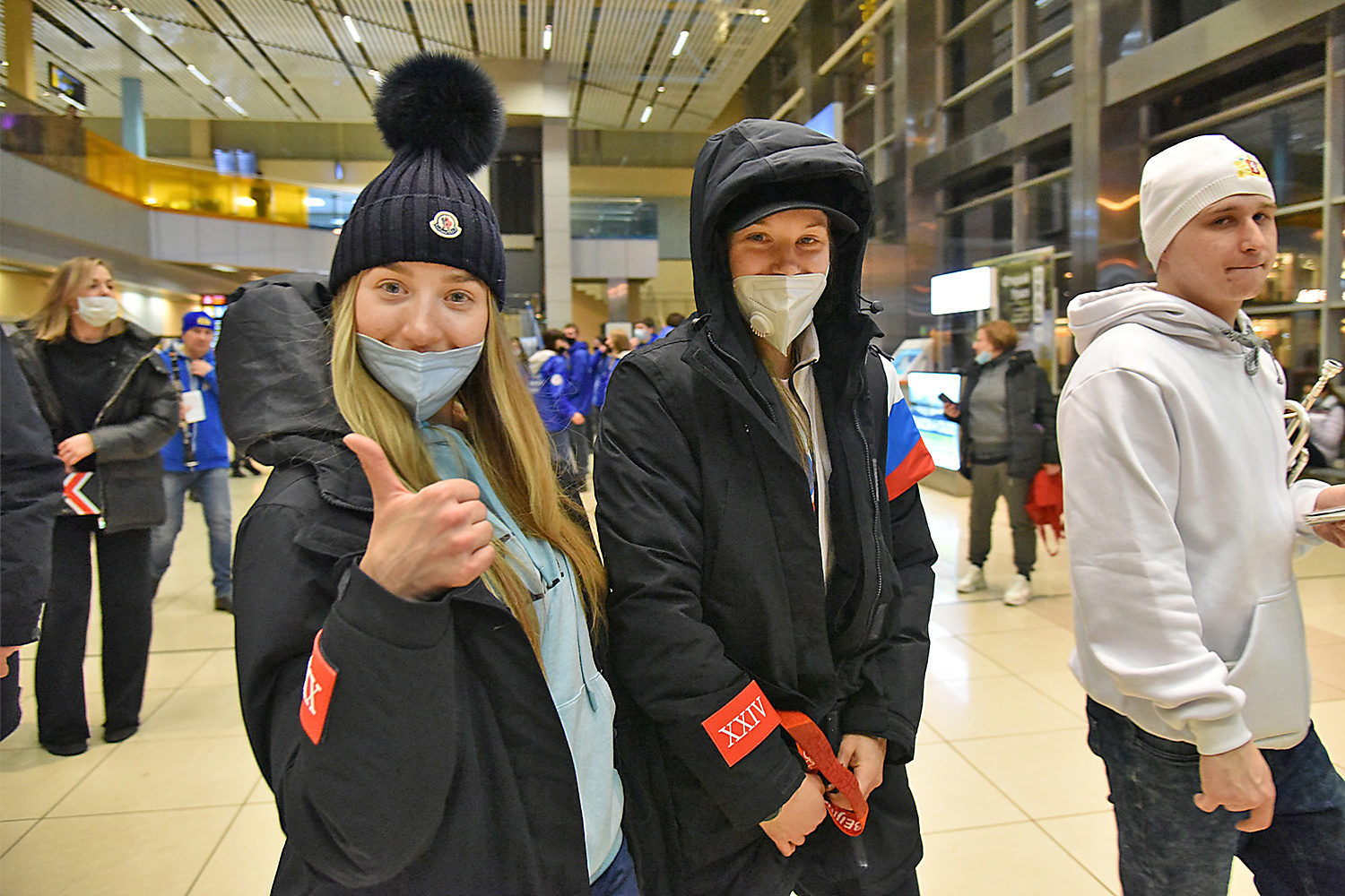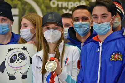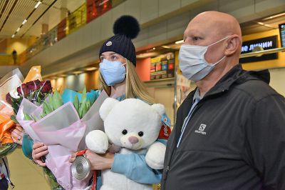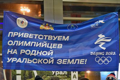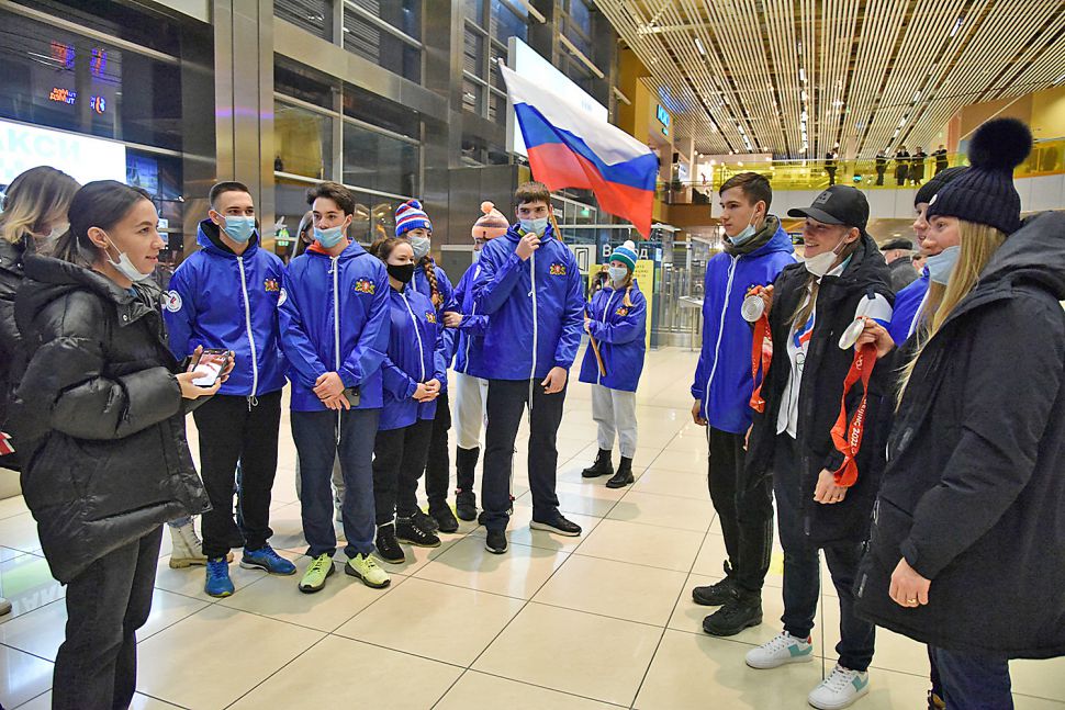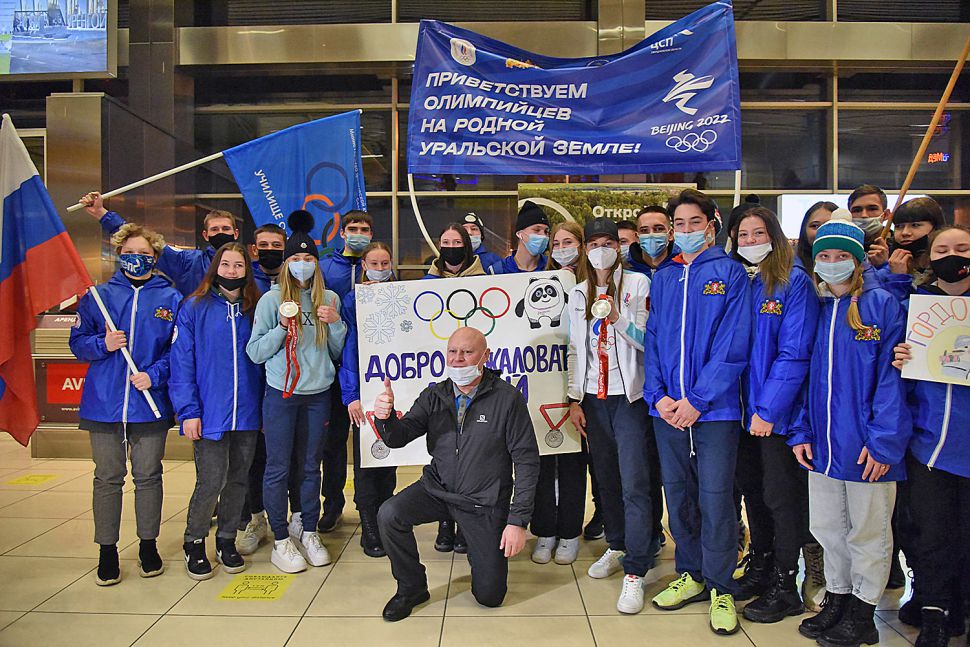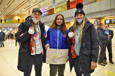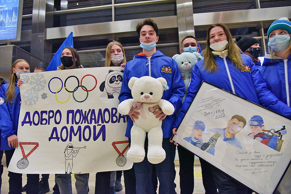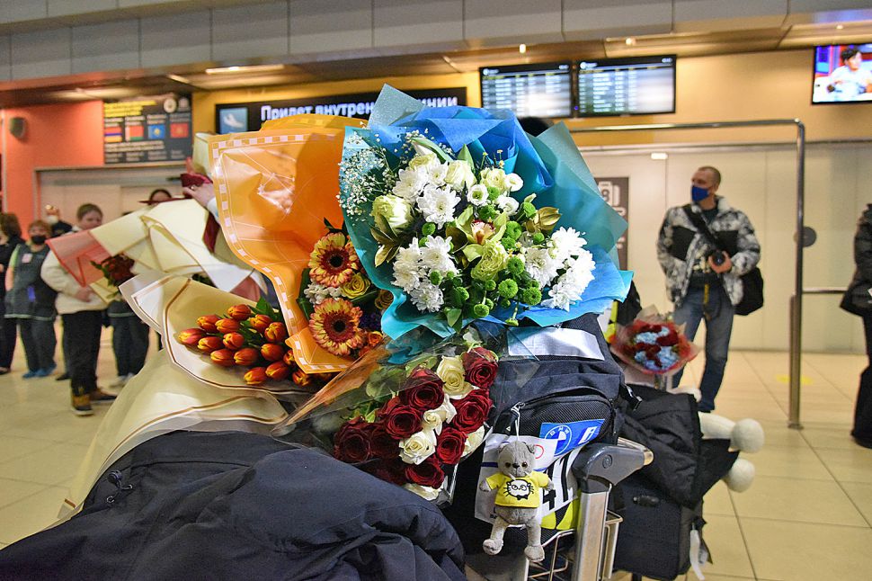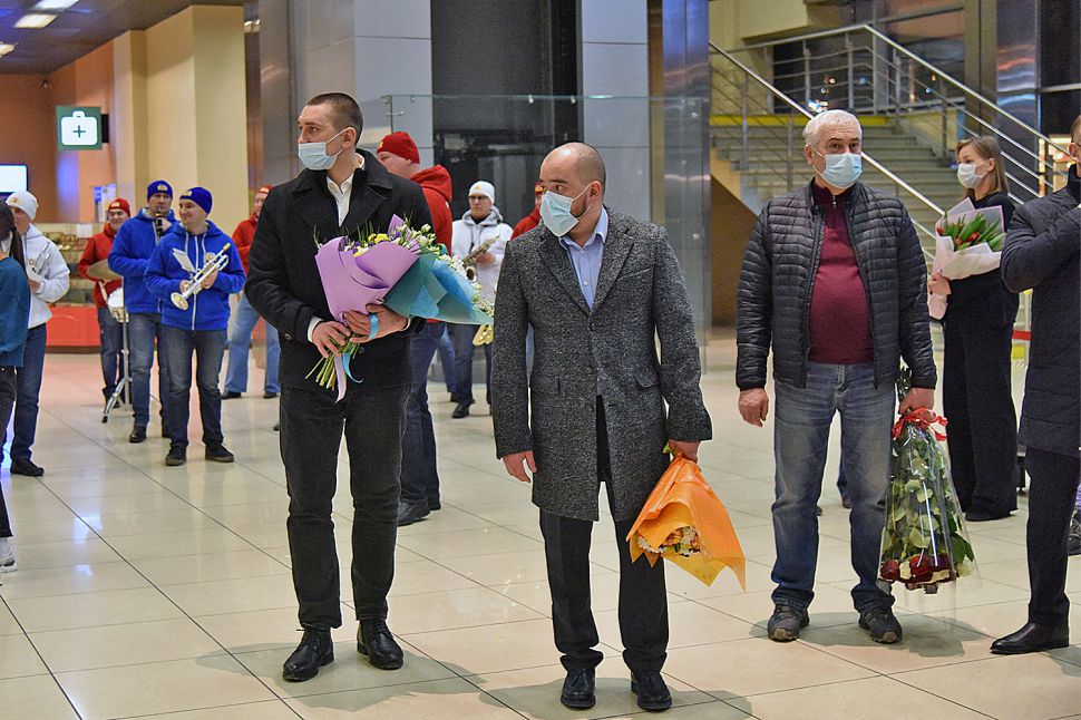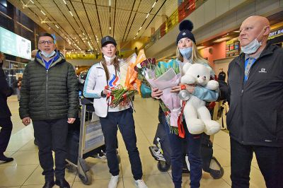 Биатлонисток встречали с цветами и оркестром. В аэропорт Кольцово приехали воспитанники Школы олимпийского резерва, а также министр физической культуры и спорта Леонид Рапопорт.