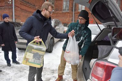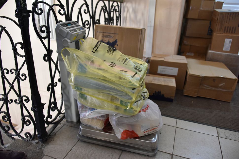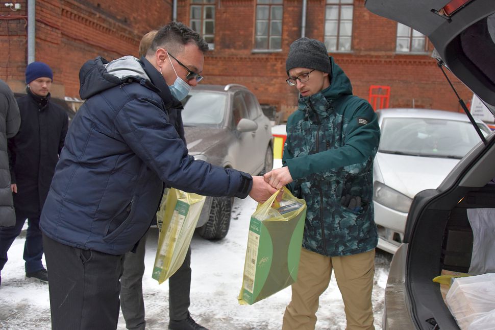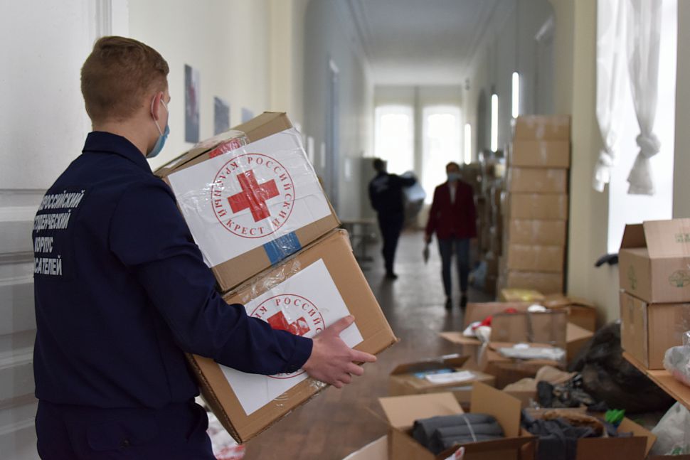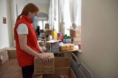 Наборы с продуктами и вещами первой необходимости приняли волонтеры Дома добровольцев.