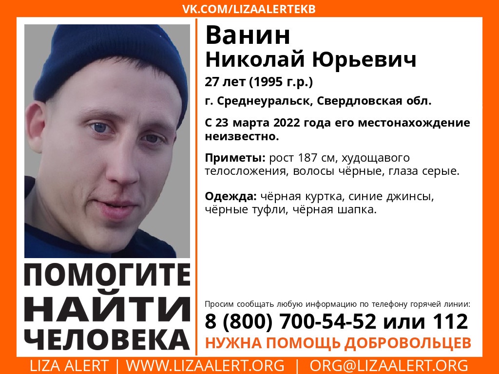 В день пропажи Николай Ванин был одет в черную куртку и шапку, синие джинсы и черные туфли. Рост пропавшего составляет 187 см, он имеет худощавое телосложение, темные волосы и серые глаза.