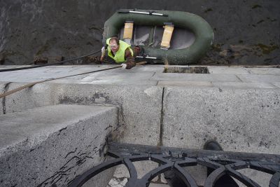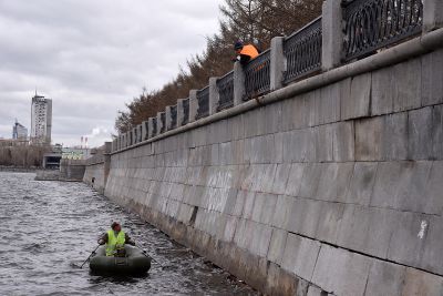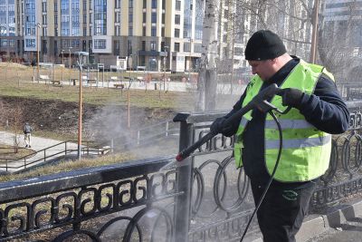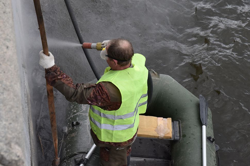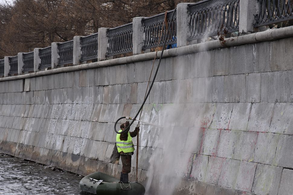 Что касается гранитных набережных городского пруда, то они очищаются с помощью пескоструйной машины. Иногда приходится использовать шлифовальные машинки и снимать несколько слоев гранита – настолько краска въедается в покрытие.