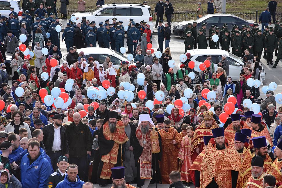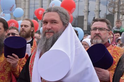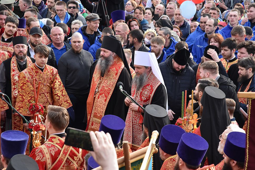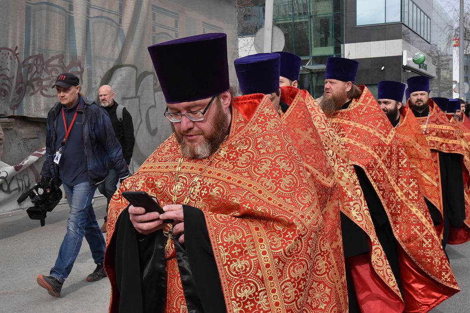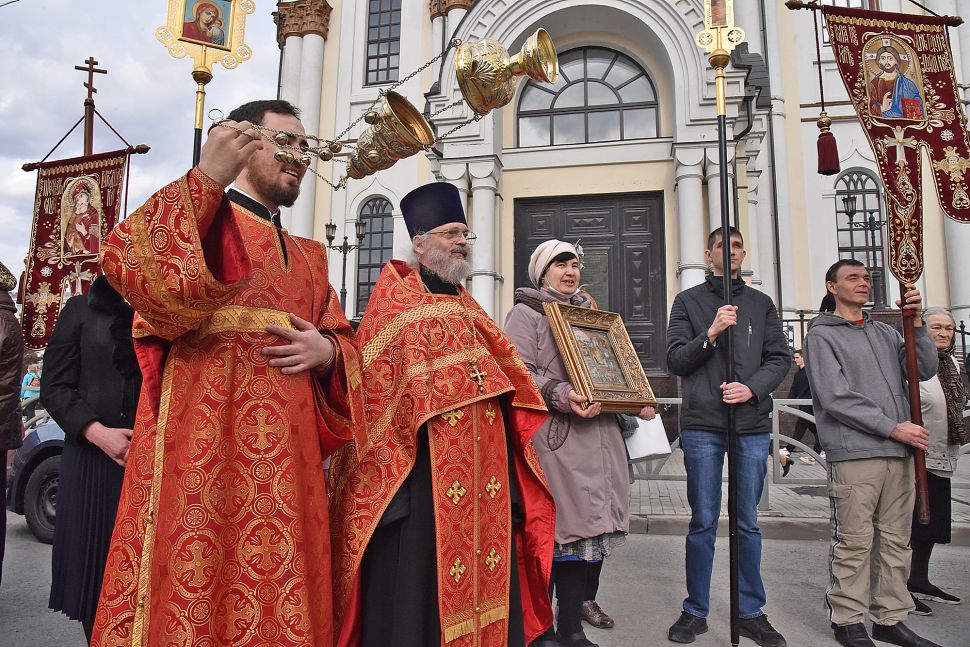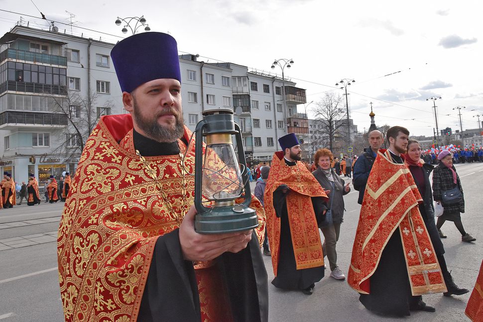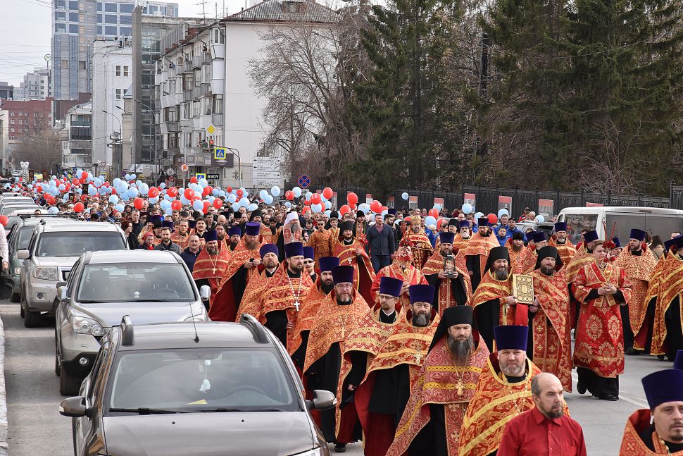 Прихожане прошли по улицам Екатеринбурга с хоругвями и иконами, священники несли ковчеги с частицами мощей православных святых: святой великомученицы Екатерины Александрийской, святого благоверного Александра Невского, святого праведного Симеона Верхотурского и другие святыни, а также Благодатный огонь из Иерусалима.