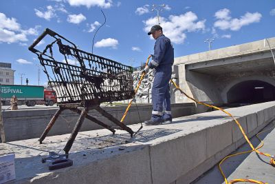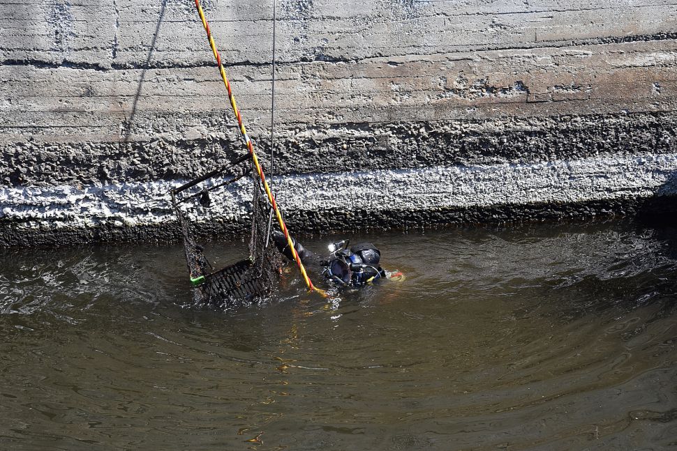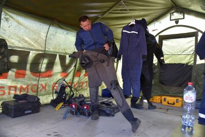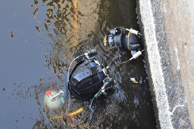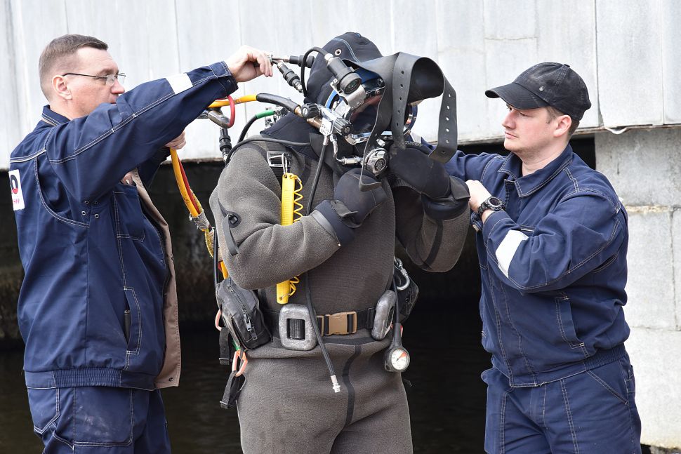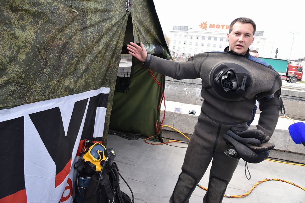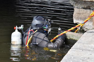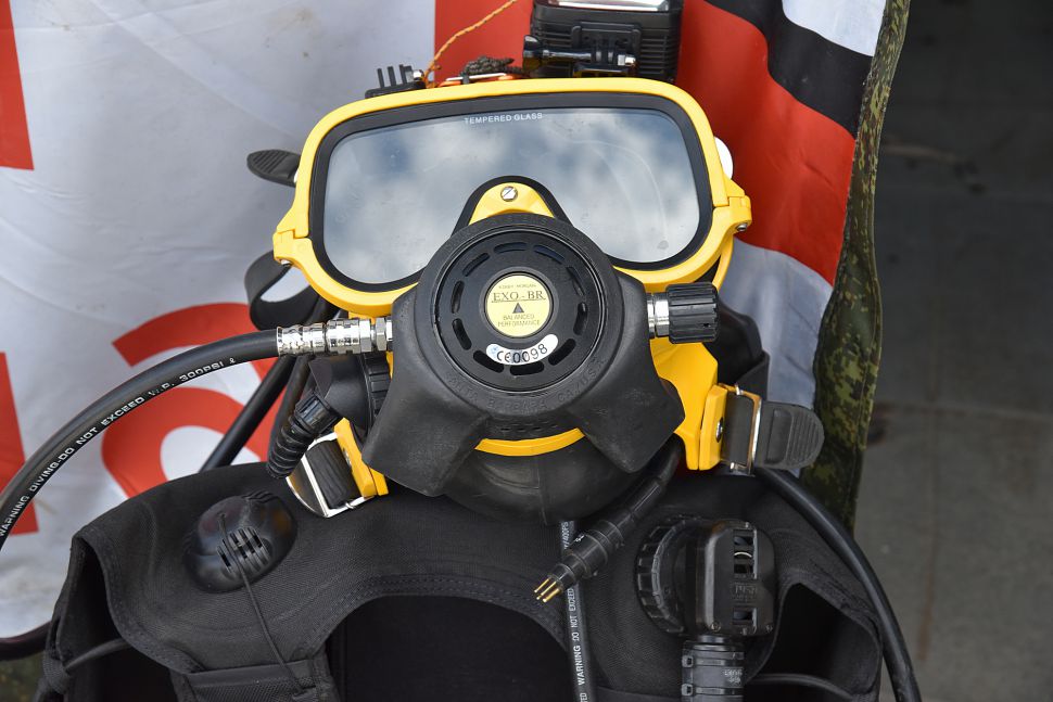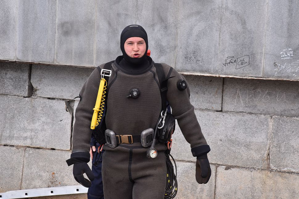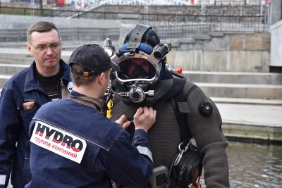 Водолаз специализированного предприятия «ГИДРО» несколько часов работал в мутной воды. Он даже вытащил со дна реки продуктовую тележку.