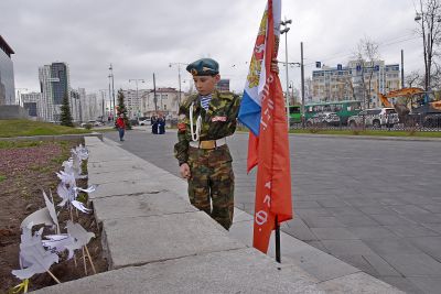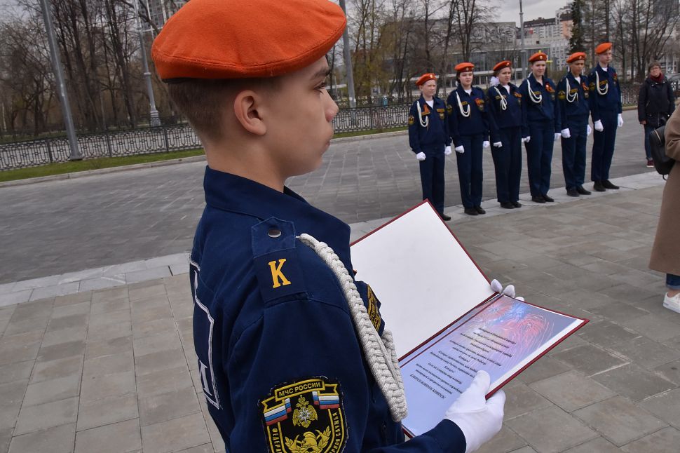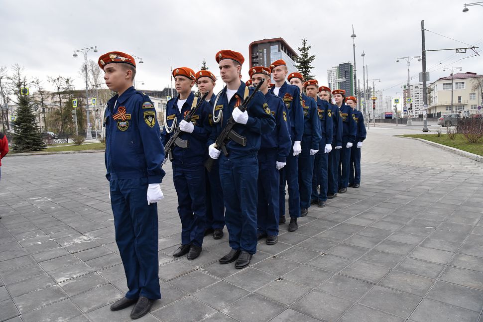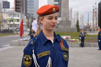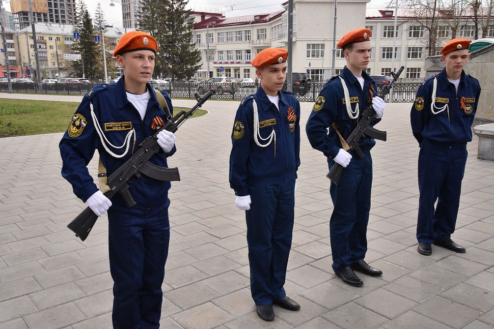 В рамках акции у мемориала «Вечный огонь» на площади Уральских Коммунаров в Екатеринбурге школьники приступили к несению почетного караула.