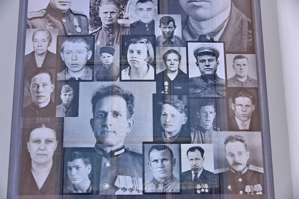 Коллективный портрет объединил и участников боев, и тружеников тыла, в том числе сотрудников Свердловской железной дороги. Черными рамками отмечены лица тех, кто не вернулся с фронта.